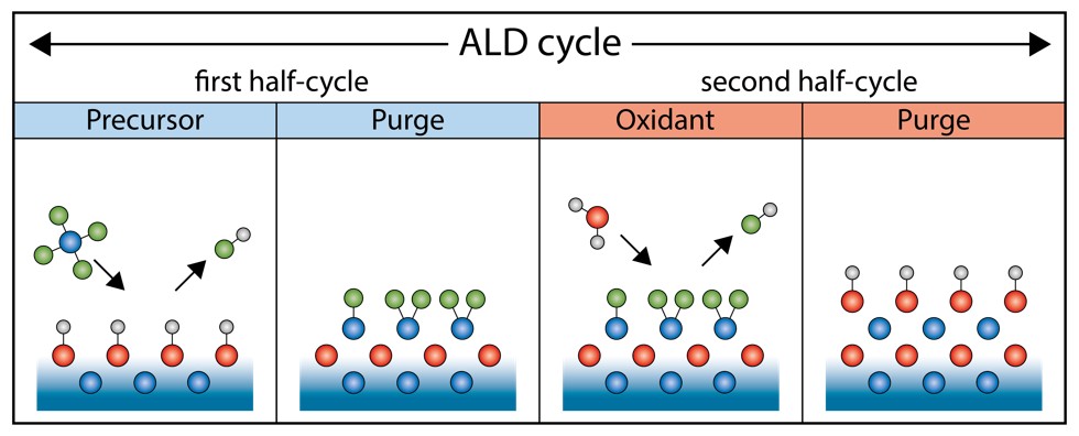 Atomic layer deposition is a vapor-phase deposition technique in which thin films are prepared sub-monolayer by sub-monolayer by repeating two subsequently executed half cycles (Fig. 1). The surface reactions are self-limiting, which leads to excellent growth control (atomic layer precision), uniform deposition over large areas, and conformal deposition in high aspect ratio substrates.