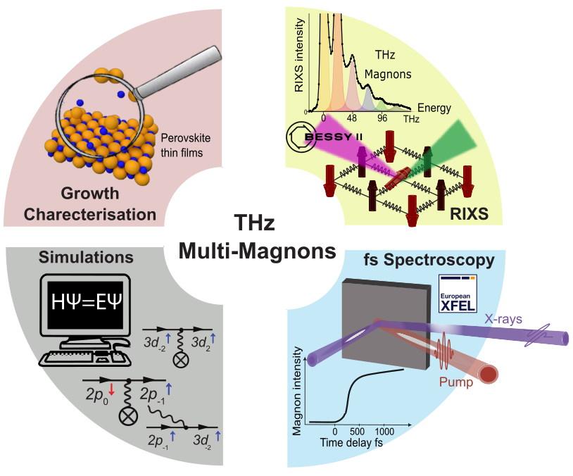 Unsere experimentellen Werkzeuge basieren auf fortschrittlichen Röntgenspektroskopien wie dem magnetischen Dichroismus und der resonanten inelastischen Röntgenstreuung, die an Synchrotrons und Freie-Elektronen-Lasern durchgeführt werden. Wir entwickeln neue Probenumgebungen und Experimente, um die Ausbreitung magnetischer Anregungen und den Impulsübertrag zwischen Spin und Kristallgitter zu untersuchen. Letzteres ist von besonderem Interesse für die Untersuchung von Multi-Magnonanregungen. Um unsere Daten zu interpretieren, führen wir schließlich theoretische Berechnungen auf der Grundlage von Multiplet- und DFT-Methoden durch, um die zugrunde liegenden Mechanismen zu verstehen, die die Eigenschaften dieser Systeme bestimmen.
