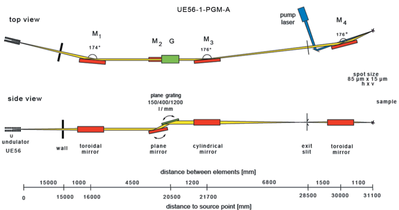 Soft x-ray beamline for the FEMTOSPEX Surface Dynamics of time resolved Electron Spectroscopy for Chemical Analysis with vertical, horizontal and elliptical polarization covering the range of ~100 - 1400 eV with an x-ray spot size of approximately 80 µm (horizontal). This beamline is part of FemtoSpeX which allows to perform femtosecond time-resolved experiments using the slicing facility. One can also do picosecond measurements using the high resolution (1200l/mm) grating. An ultrafast laser system with OPA allows for excitation of the sample at various wavelengths.