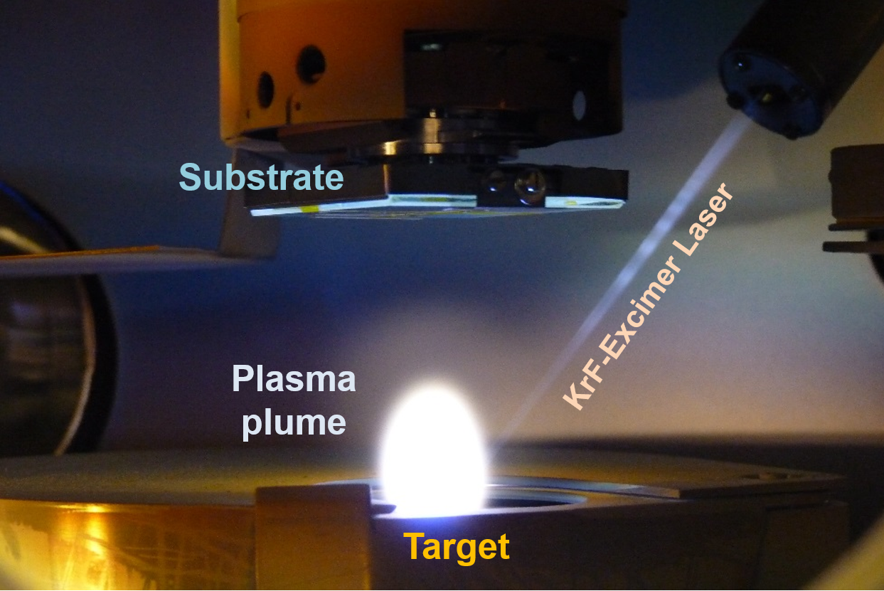 Pulsed Laser Deposition is a physical vapor deposition technique in which compact and dense films (e.g. metal oxides) with a high electronic quality can be grown. In this technique, a pulsed high-power laser is used to evaporate a target of the desired material in a vacuum chamber. The ablation event produces a laser-induced luminous plasma plume that expands rapidly away from the target surface. Consequently, the ablated material is deposited on a substrate.
