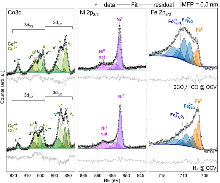 Our approach integrates material synthesis with advanced characterization techniques. We use synchrotron-based Near Ambient Pressure X-ray Photoelectron Spectroscopy (NAP-XPS) and X-ray Absorption Spectroscopy (XAS) to study these materials under relevant operation conditions. NAP-XPS (Figure 2) allows us to monitor surface chemical changes induced by the reaction environment, such as temperature and applied potential. By systematically analyzing these structure-function relationships at the solid-gas interface, we aim to improve catalytic efficiency, electrochemical activity, and stability, while also making these technologies more cost-effective. Our research contributes to more sustainable energy solutions by enhancing the performance and scalability of catalytic and solid oxide cell technologies.