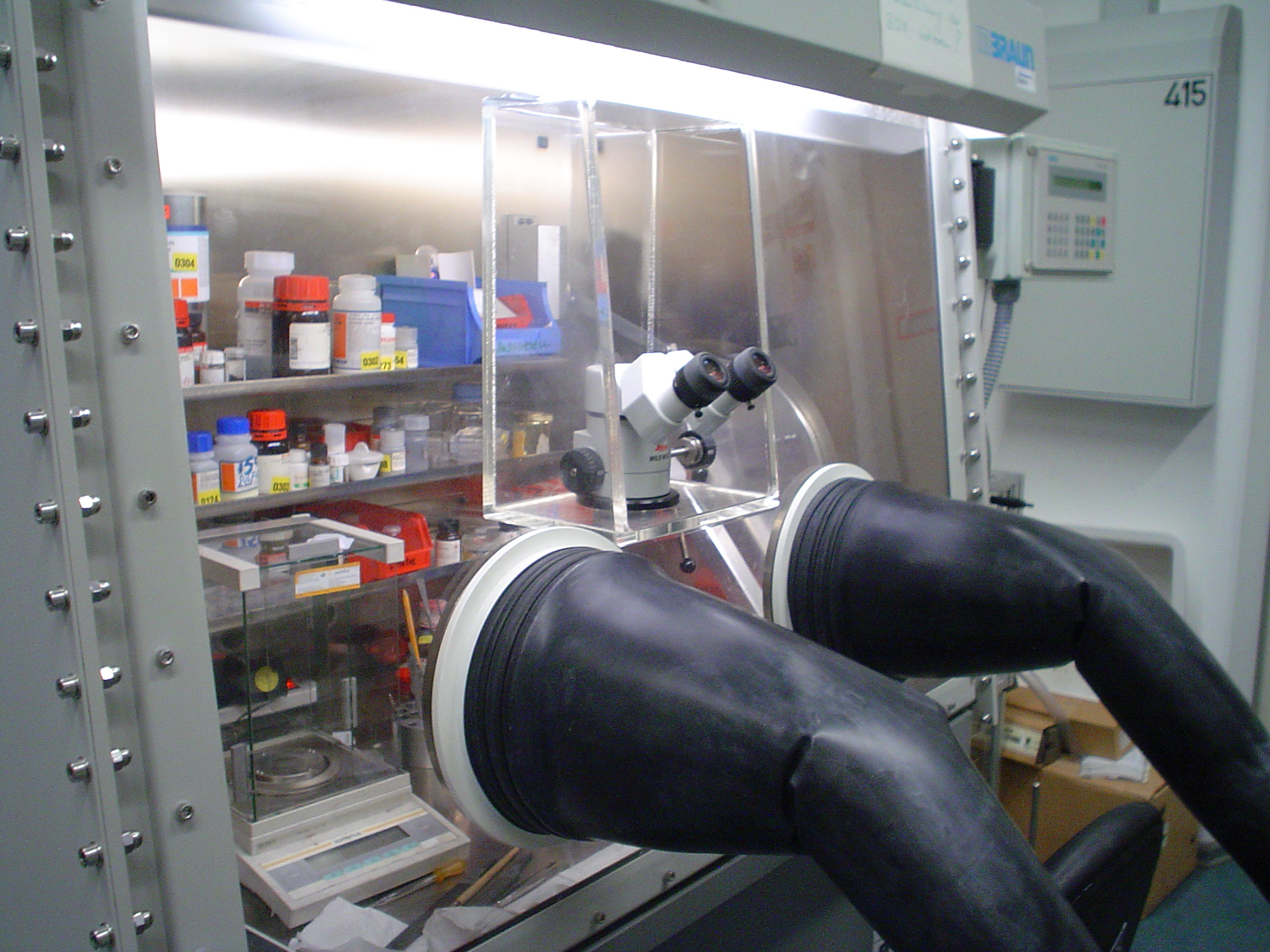 This glove box is used to prepare materials under pure Argon atmossphere. Users also can store samples there. Examples are air- and water sensitive materials but also some toxic or flammable substances. Two transfer chambers are available for large equipment and small items. It is equipped with microscope and balance.
