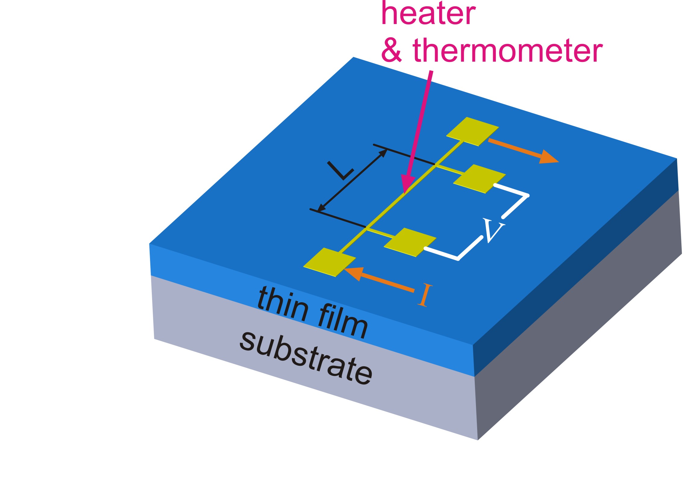 The 3ω-method allows the measurement of the thermal conductivity of bulk material and thin films. This measurement technique requires a micro heater on top of the sample which can be defined by means of lithography and subsequent metallization. Fig. 1 shows a micro heater set-up on top of a thin film. The micro heater is periodically heated by an AC current which leads to a temperature oscillation. The temperature change of the micro heater leads to a resistance change of the micro heater that creates higher harmonic voltage signals. Those higher harmonics are detected with state-of-the art lock in amplifiers. In particular the voltage signal of the threefold frequency of the input signal is used to determine thermal diffusivity and thermal conductivity. Recent literature shows that anisotropic thermal conductivity can be measured by a modified heater arrangement and detection of the second harmonic of the voltage signal [1].