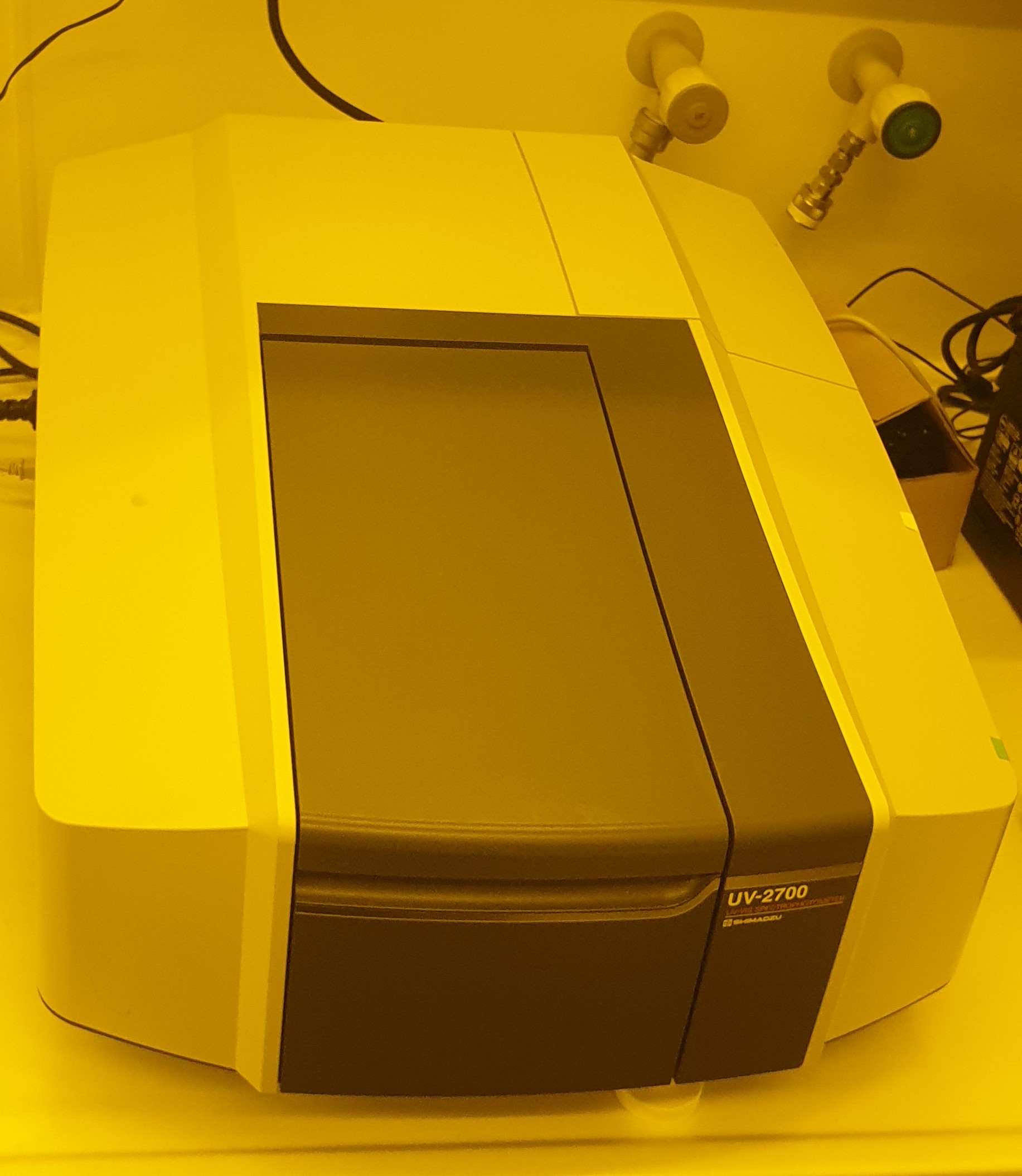 The Shimadzu UV-2700 is a mid-range UV spectrometer in use by the Users Chemistry Laboratory. It contains a double monochromator system capable of 8-Abs measurements. It is optimal for measuring samples with low transmittance.