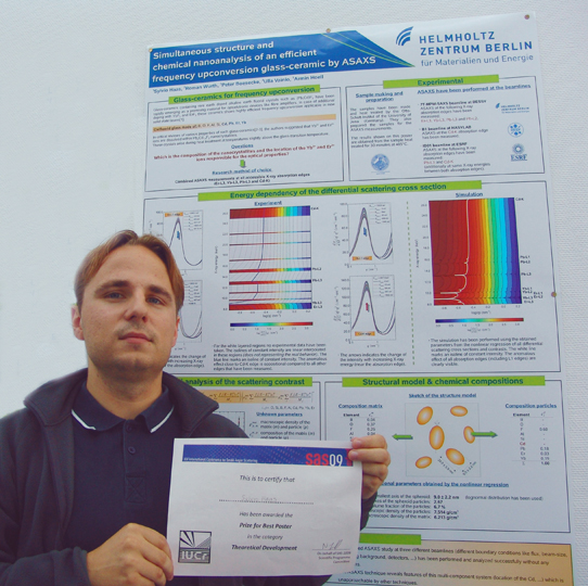 Der Nachwuchswissenschaftler Sylvio Haas, Institut für Angewandte Materialforschung des HZB, ist Posterpreisträger der SAS 2009. Prämiert wurden vier Forschungsarbeiten von insgesamt 330 Posterbeiträgen, die in Oxford präsentiert wurden. Der junge Forscher erhielt den Preis für seine herausragende Arbeit zur Nanostrukturaufklärung mit der ASAXS-Methode (Anomalous Small-Angle X-ray Scattering). Während die Kleinwinkelstreuung (Small-Angle Scattering) zerstörungsfrei gemittelte Informationen über Nanostrukturen, wie beispielsweise die Größenverteilung, Form und Orientierung von Nanoteilchen, liefert, ist es mit Anomalous Small-Angle X-ray Scattering (ASAXS) darüber hinaus möglich, zusätzlich die chemische Zusammensetzung dieser Nanostrukturen zu bestimmen. Durch diese zusätzlichen Informationen können bei komplexen Materialien auch „falsche“ Strukturmodelle widerlegt werden. Bei einem ASAXS-Experiment wird die verwendete Röntgenenergie verändert. Dadurch erhöhen oder erniedrigen sich die Kontraste der einzelnen Strukturen. Die ASAXS Methode kann auf verschiedenste Materialien (Legierungen, biologische Systeme, Polymere, Katalysatormaterialien, etc.) angewendet werden. Sylvio Haas konnte mit der ASAXS-Methode in seiner Arbeit erstmals die Zusammensetzung von Nanokristallen in einer Glaskeramik quantitativ bestimmen. Diese Nanokristalle sind photonisch aktiv. Photonische Kristalle können mit ihrer besonderen Gitterstruktur bestimmte Wellenlängen elektromagnetischer Strahlung filtern oder verändern. Sylvio Haas beobachtete bei Aktivierung mit Photonen geringer Frequenz bei seinen Kristallen eine Frequenzerhöhung. Das heißt aus infra-rotem wird grünes Licht. Mögliche Anwendungsgebiete solcher Glaskeramiken liegen zum Beispiel bei Hochleistungslasern oder optischen Verstärkern. Auf Grundlage dieser sehr umfangreichen Forschungsarbeit wird der junge Wissenschaftler nun seine Dissertation schreiben. Hier finden Sie das Poster von Sylvio HAAS mit dem Thema 'Simultaneous structure and chemical nano-analysis of an efficient frequency upconversion glass-ceramic by ASAXS' Weitere Preisträger waren Dr. Anke Maerten und Johannes Prass (Max-Planck-Institut für Kolloid- und Grenzflächenforschung, Golm) sowie Dr. Alexander Hexemer (Lawrence Berkley National Laboratory, USA).