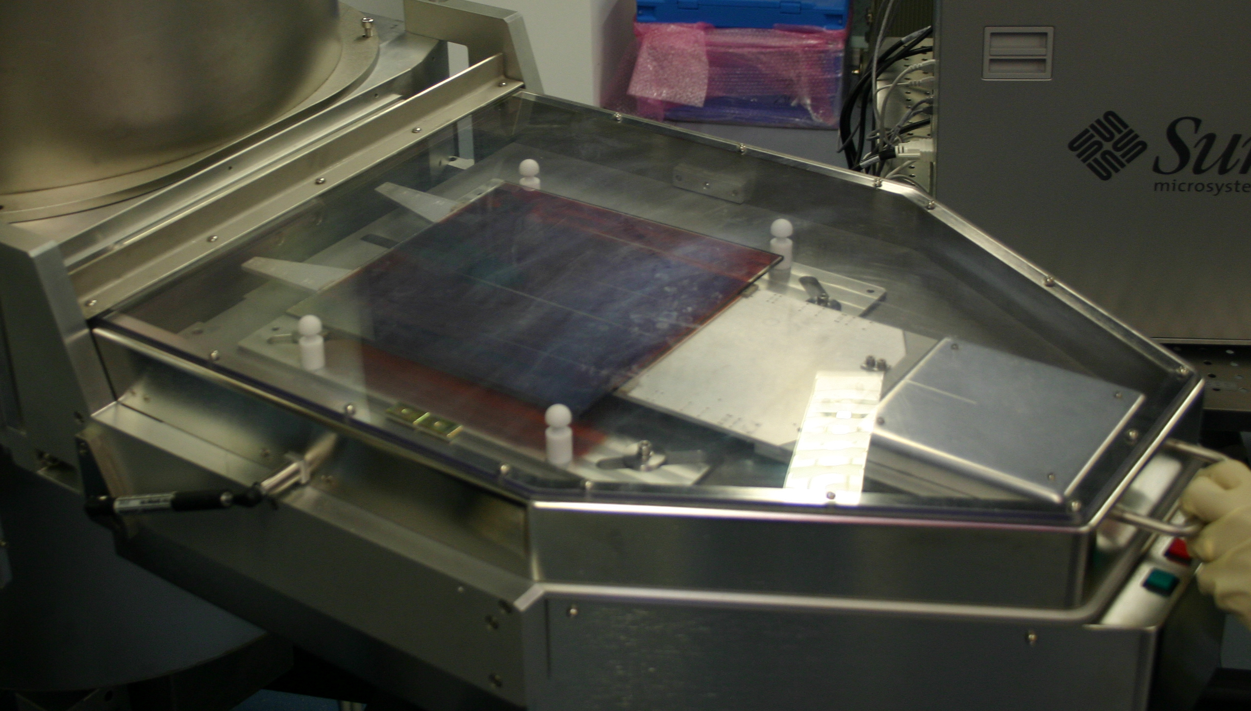 Ein neuer Abschnitt in der Geschichte des PVcomB hat begonnen: Am 15.11. erfolgte die erste eigene Beschichtung von 30 x 30 cm2 Glasmodulen mit amorphem Silizium. Die Deposition erfolgte an einer PECVD-Clusteranlage der Firma Applied Materials, Herzstück der Forschungslinie für Dünnschicht-Silizium, die am PVcomB aufgebaut wird.