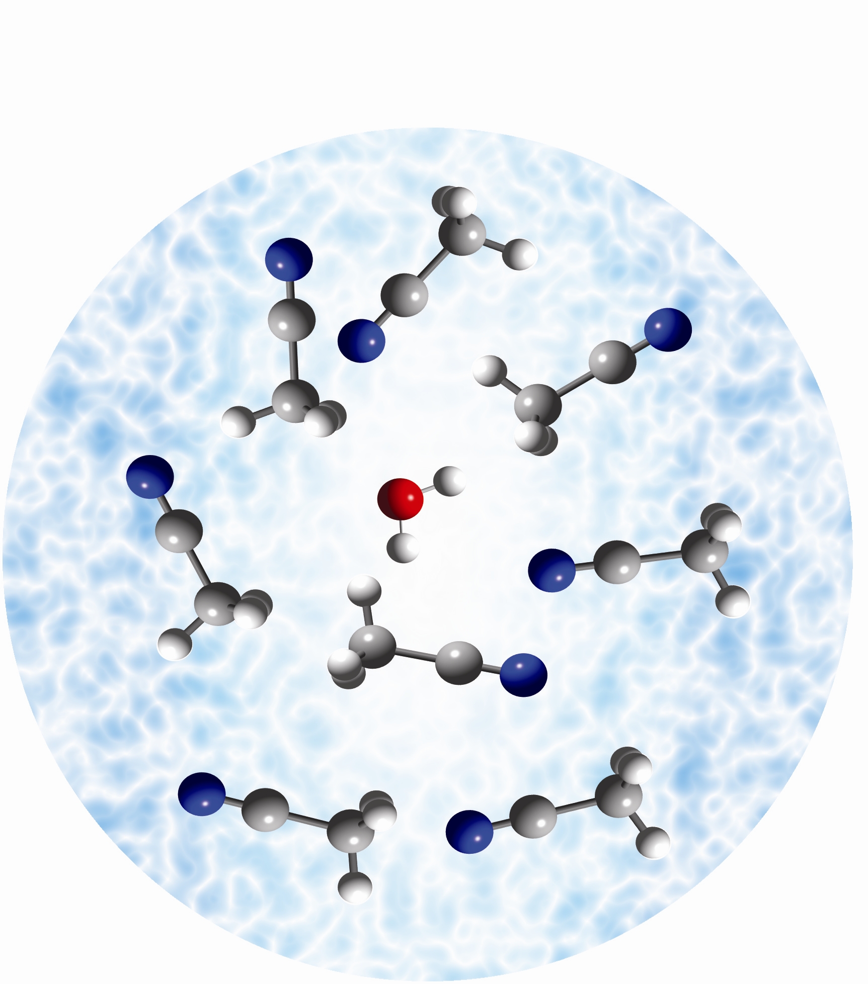 Schematische Darstellung eines Wassermolek&uuml;ls,<br />welches von Acetonitrilmolek&uuml;len umgeben ist.