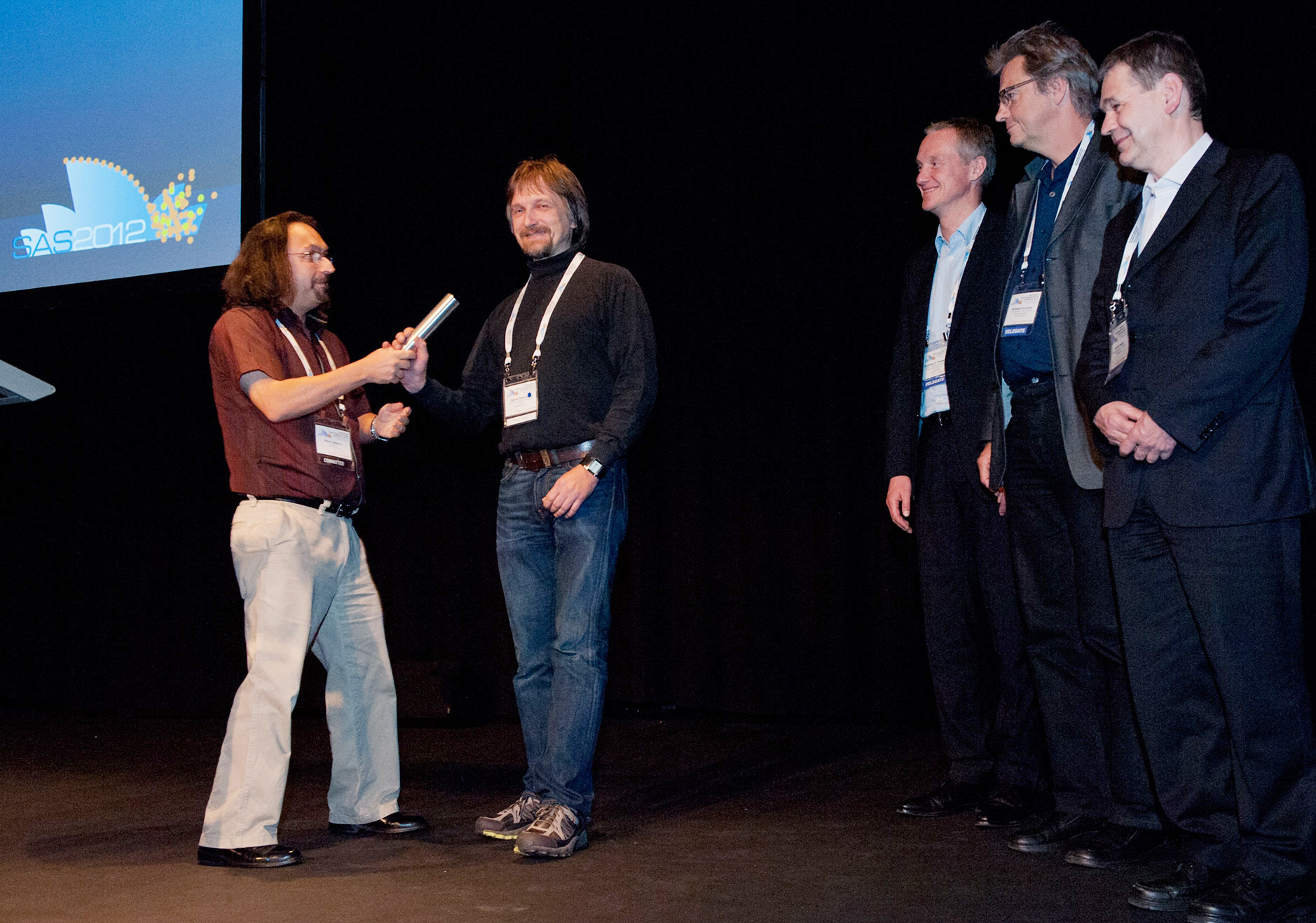 Das Helmholtz-Zentrum Berlin wird 2015 die größte internationale Konferenz für Kleinwinkelstreuung, die „International small-angle scattering conference“ – kurz SAS 2015 –, in Berlin ausrichten. Daniel Clemens vom HZB warb auf der diesjährigen Konferenz in Sydney für die Berliner Veranstaltung. Der leitende Organisator („Chairman“) der SAS 2012, Elliot Gilbert, überreichte dem gemeinsamen Organisationsteam in Sydney den Staffelstab für die nächste Konferenz und wünschte viel Erfolg bei den Vorbereitungen. Entgegengenommen haben ihn Daniel Clemens, Armin Hoell (beide HZB), Michael Krumrey (PTB) und Andreas Thünemann (BAM).