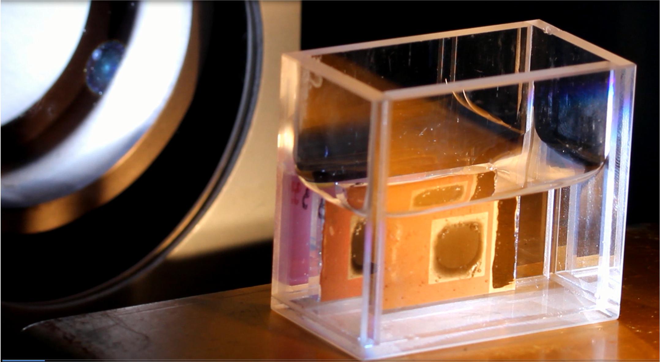 Der Vorteil der photovoltaischen Zellen des PVcomB ist deren „Superstrat- Architektur“: Das Licht fällt durch den transparenten Frontkontakt ein, der auf dem Trägerglas abgeschieden ist; es gibt keine Verschattung durch aufgebrachte Katalysatoren. Die Katalysatoren befinden sich nämlich auf der Rückseite der Solarzelle und sind im Kontakt mit dem Wasser/Säuregemisch. Dieses ist sehr angriffslustig, das heißt korrosiv, so dass Diana Stellmach im ersten Schritt den üblichen Zinnoxid-Silber-Rückkontakt durch eine Beschichtung mit Titan von etwa 400 Nanometern Dicke ersetzen musste. Im zweiten Schritt entwickelte sie eine Lösung, um mit dem Aufbringen des Katalysators gleichzeitig die Zelle gegen Korrosion zu schützen: Sie mischte RuO2-Nanoteilchen in ein leitfähiges Polymer (PEDOT:PSS) und trug diese Mischung als Katalysator für die Sauerstoffbildung auf dem Rückseitenkontakt der Zelle auf. Auf den Frontkontakt wurden in analoger Weise Platin Nanoteilchen aufgebracht, an denen die Wasserstoffentwicklung abläuft.