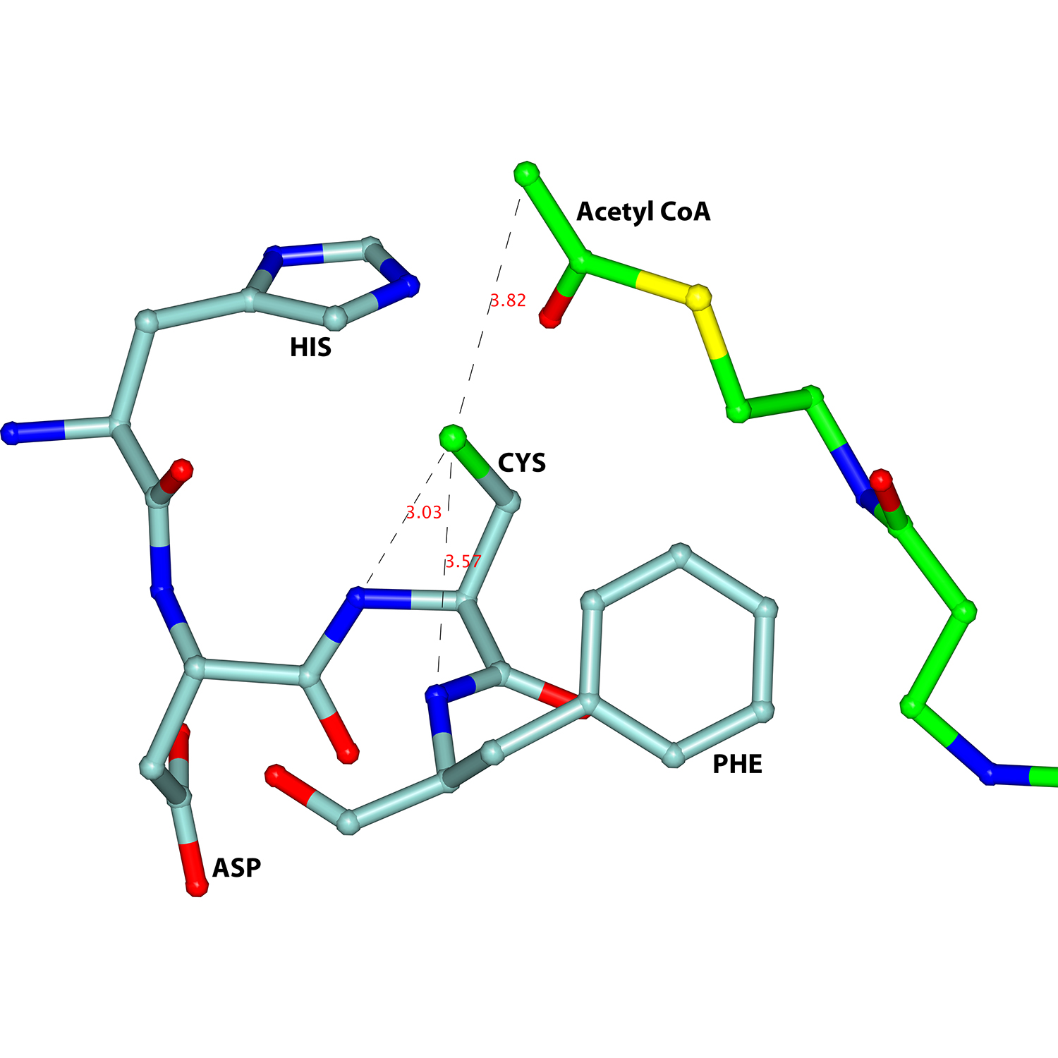 Ein Hauptmerkmal des aktiven Zentrums der trypanosomalen Thiolase ist der HDCF-Loop (HIS-ASP-CYS-PHE), dargestellt in hellem Blau.