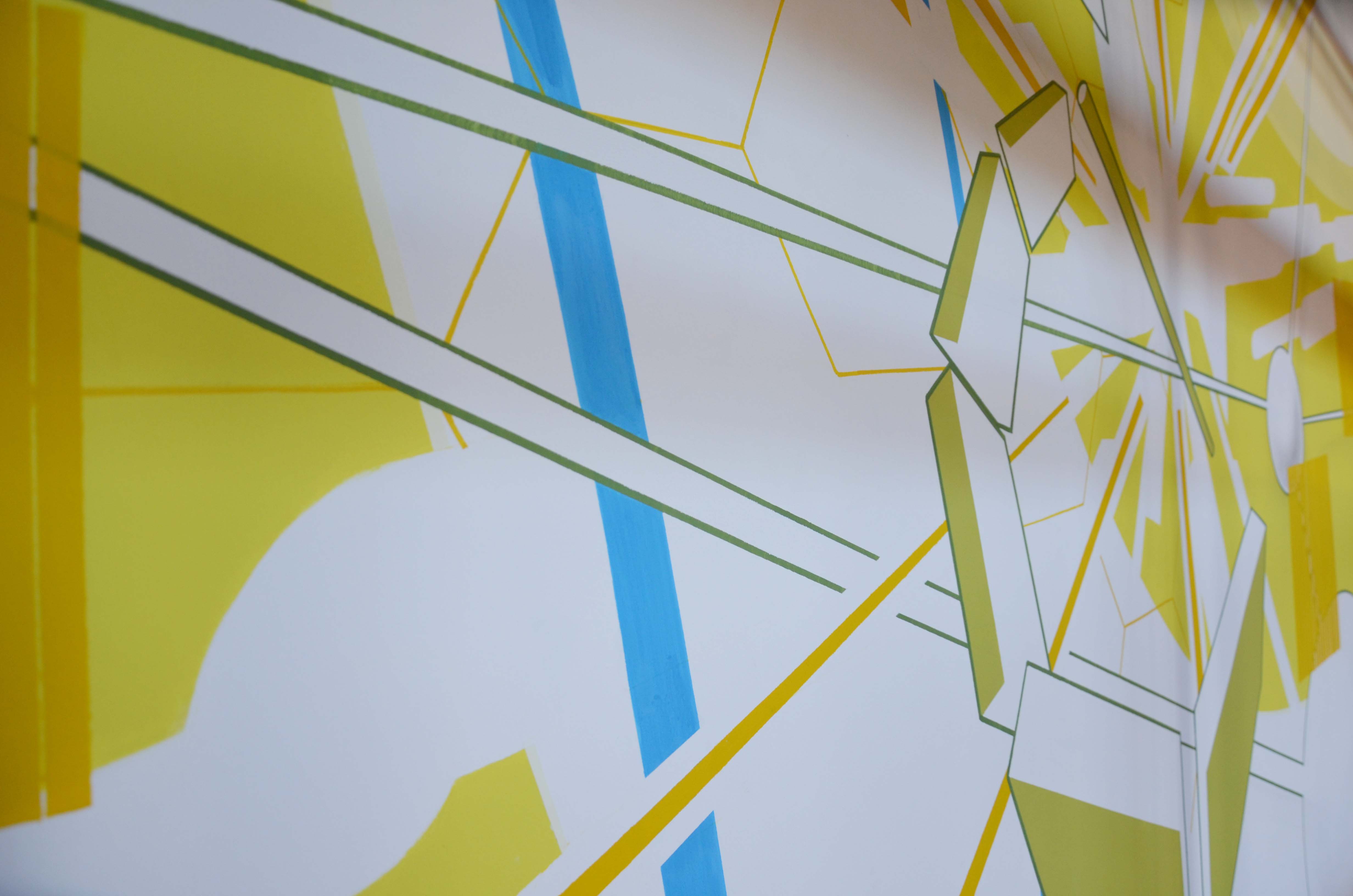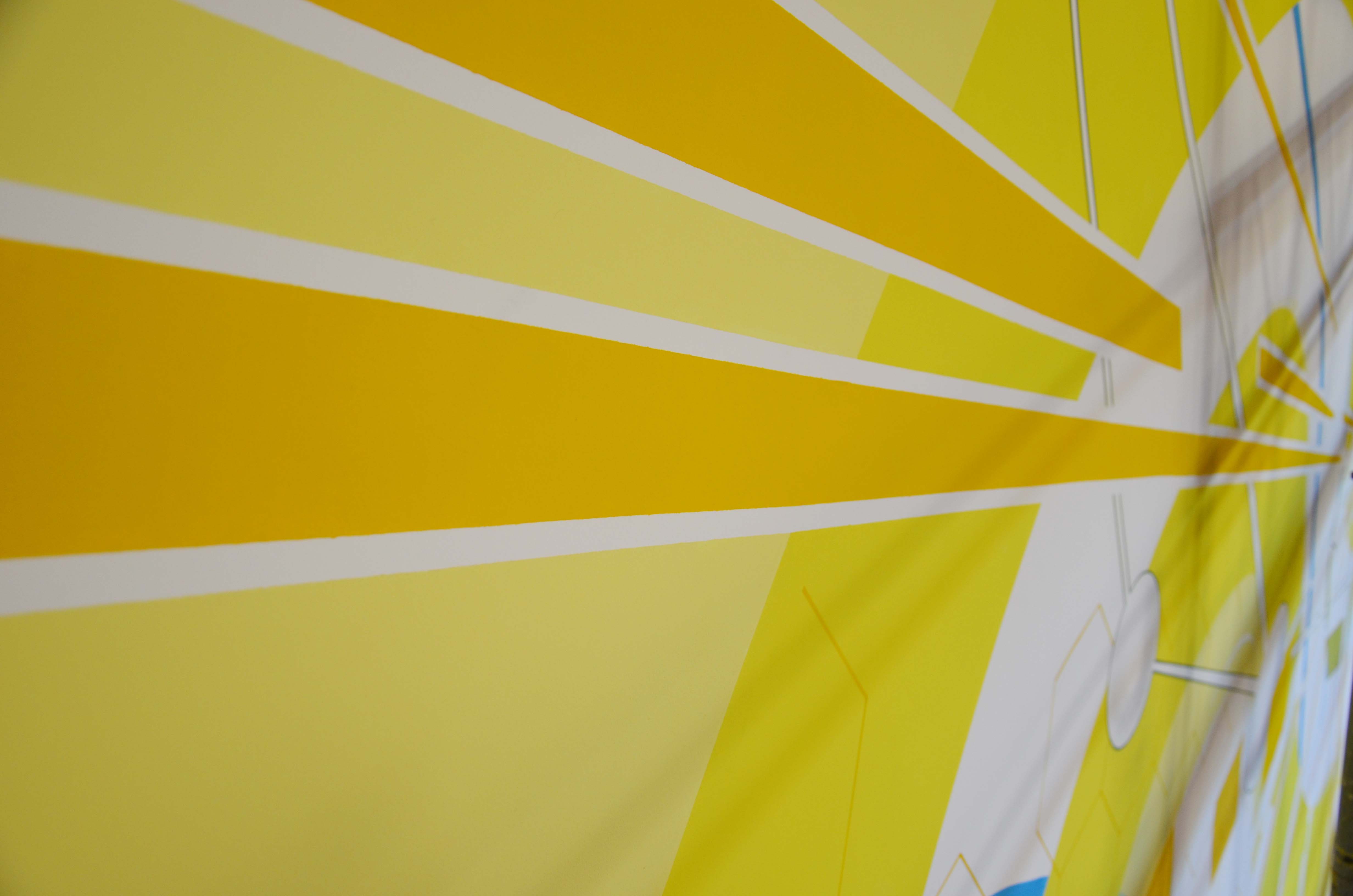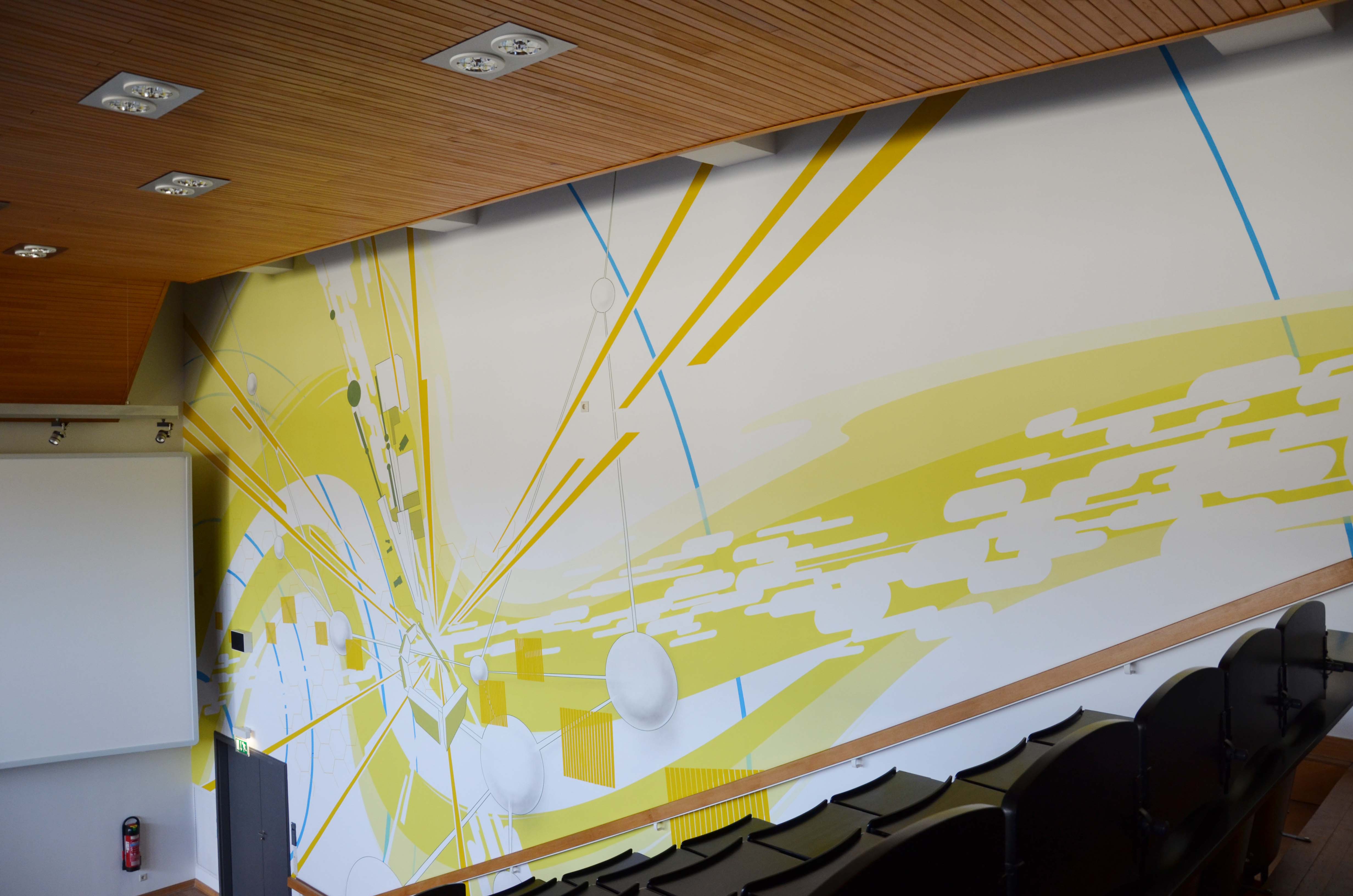 Ein leuchtendes Gelb, eine riesige Welle und starke Lichtpulse. Das Wandbild, das die Graffiti-Künstler von getting up, Gerrit Peters und Heiko Zahlmann, im Hörsaal am Standort Wannsee gemalt haben, ist eine Aufforderung zum Betrachten und Entdecken. In ihrem Entwurf haben die beiden Künstler Forschungsthemen aus dem HZB aufgegriffen und abstrahiert.