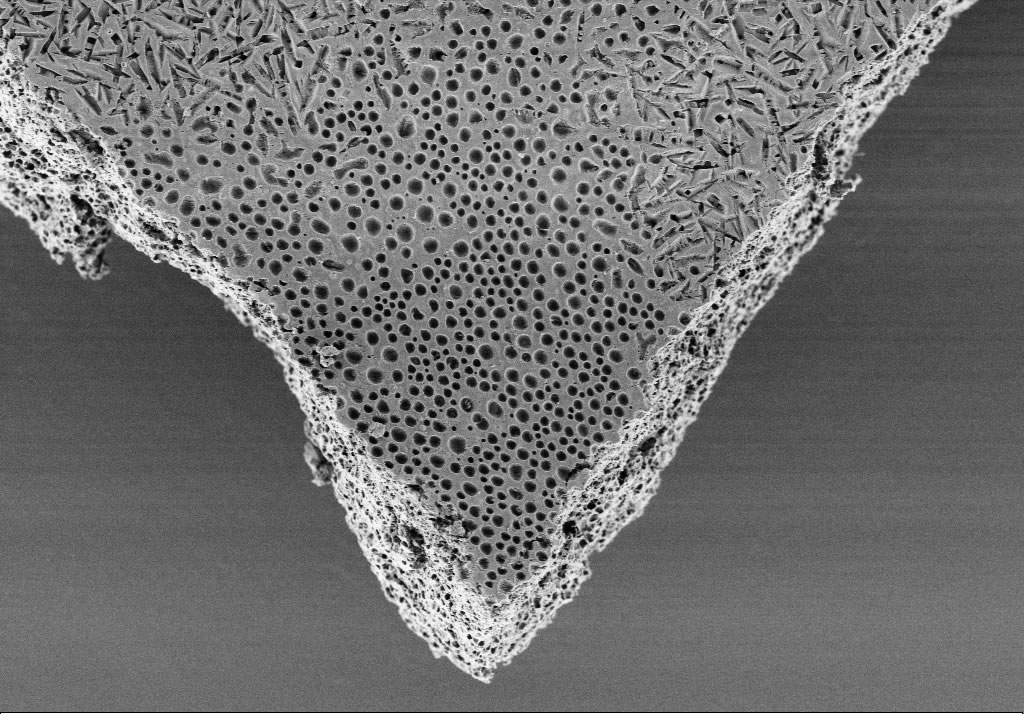 Das Material ist porös wie ein Schwamm und besteht aus Polymeren, die untereinander vernetzt sind. Dabei sind die oberen Schichten deutlich enger vernetzt als die unteren. Sobald die Membran nun bestimmte Gasmoleküle wie Azeton aufnimmt, quillt sie oben stärker auf als unten, so dass sie sich krümmt und zusammenrollt.