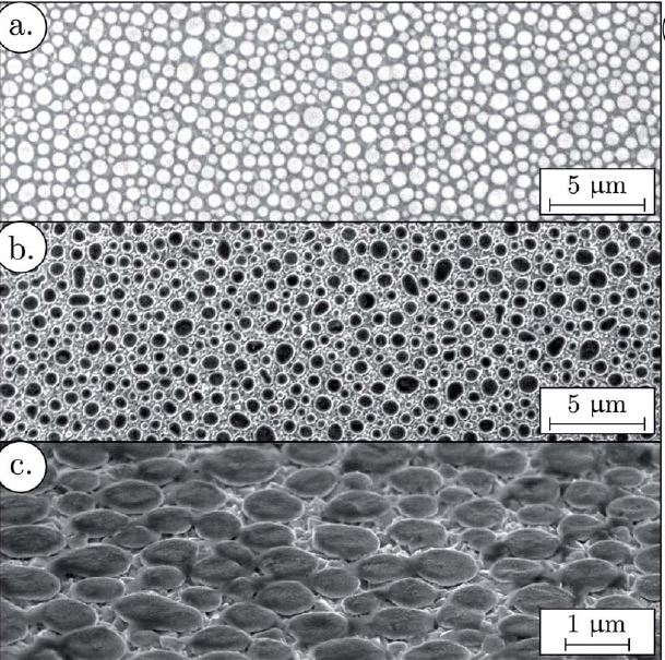 Rasterelektronenmikroskopie der Oberfläche vor der Pyrolyse (a) und nach der Pyrolyse (b und c). © EMPA
