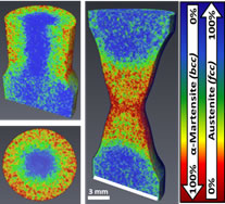 Die Forscher untersuchten Proben aus Stahl mit Durchmessern von 8 Millimetern, die anfangs hauptsächlich aus Austenit-Kristalliten (kubisch flächenzentriert) bestanden. Einige Proben wurden dann im Zugversuch plastisch verformt (zu erkennen an der Einschnürung) und andere im Torsionsversuch plastisch verdreht. Bei den Zugproben wandelten sich in der verengten Region in der Mitte, welche die höchste Verformung aufweist, die meisten Kristallite von Austenit in Martensit um (kubisch raumzentrierte Kristallform). Bei den Torsionsproben hingegen nimmt die Spannung von der Mitte zum äußeren Radius hin zu. Entsprechend war auch die Umwandlung von Austenit-Kristalliten in Martensit-Kristallite an der Oberfläche am größten, zeigten die Messungen an CONRAD. Diese quantitativen Ergebnisse stimmten hervorragend mit den Stichprobenuntersuchungen am Messinstrument E3 (Eigenspannungsanalyse, in Kooperation mit Mirko Boin) überein.