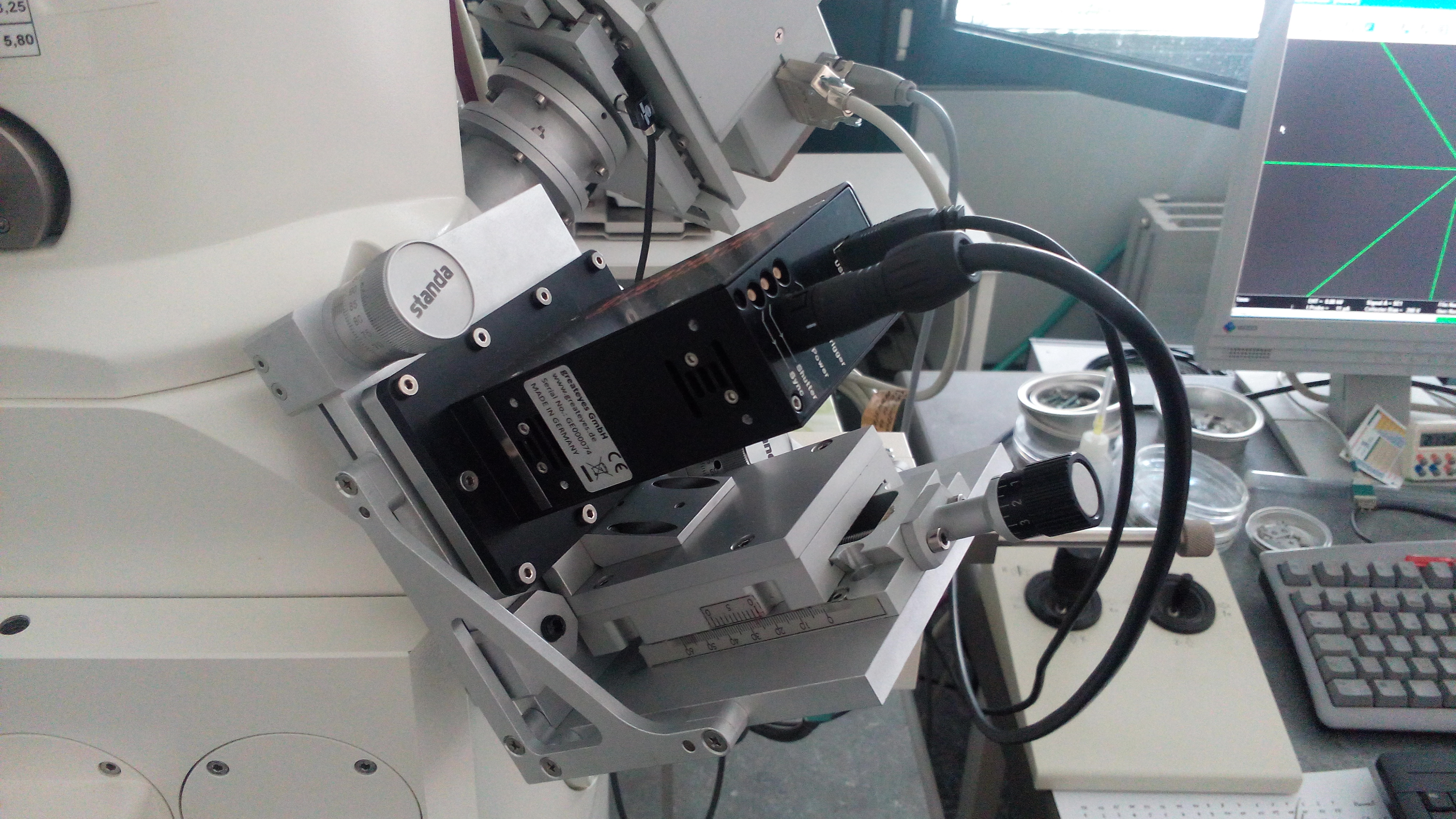 Bild des neuen WDS-Instruments, das mit Standard-Gehäuse und Standard-Flansch an ein Rasterelektronenmikroskop (Zeiss-EVO 40) angeschlossen ist.