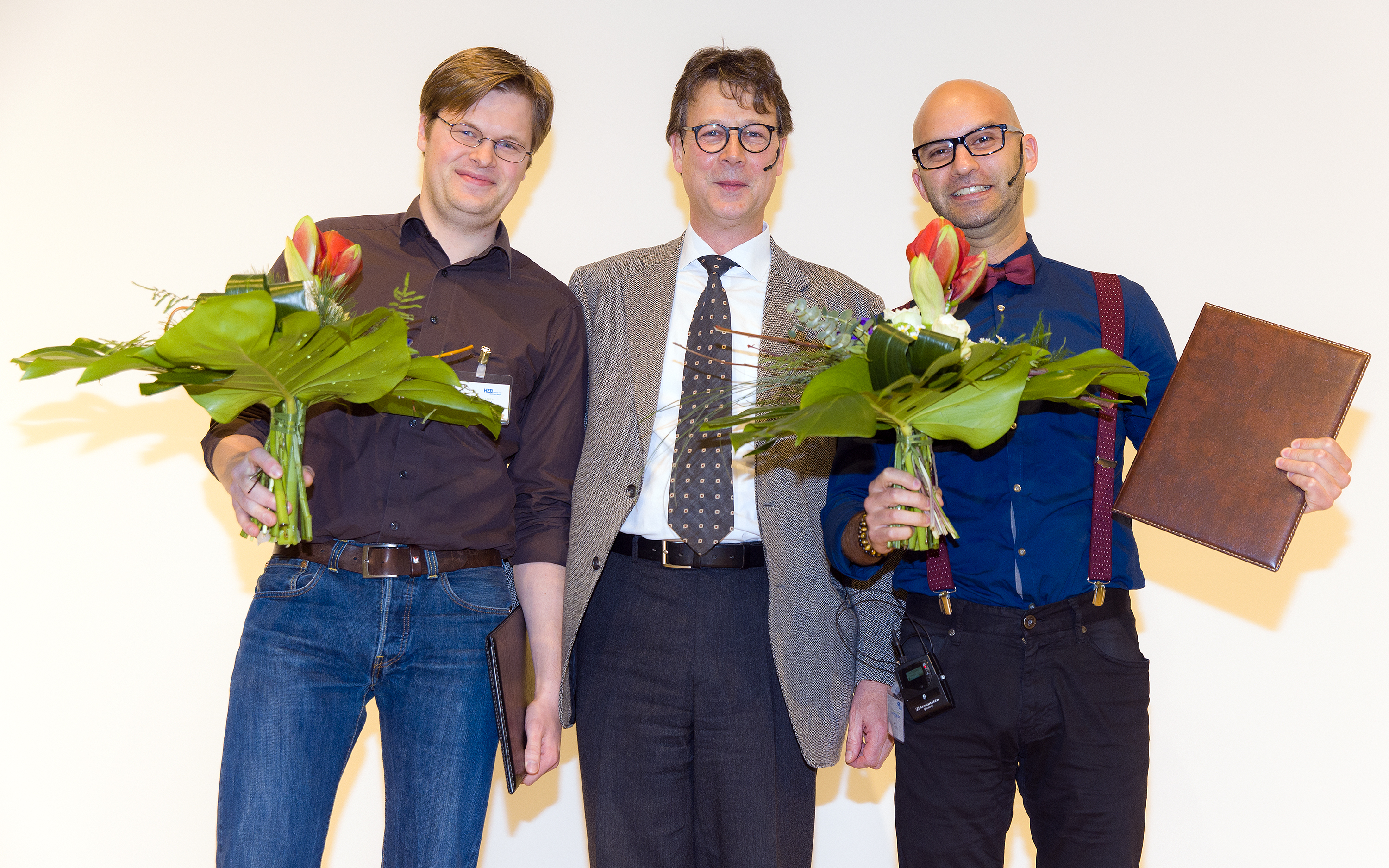 Markus Ries (links) und Alex Manuel Frano Pereira (rechts) erhielten von Prof. Mathias Richter vom Freundeskreis des HZB den Ernst-Eckhard Koch-Preis für ihre herausragenden Promotionsarbeiten. © M. Setzpfand/HZB