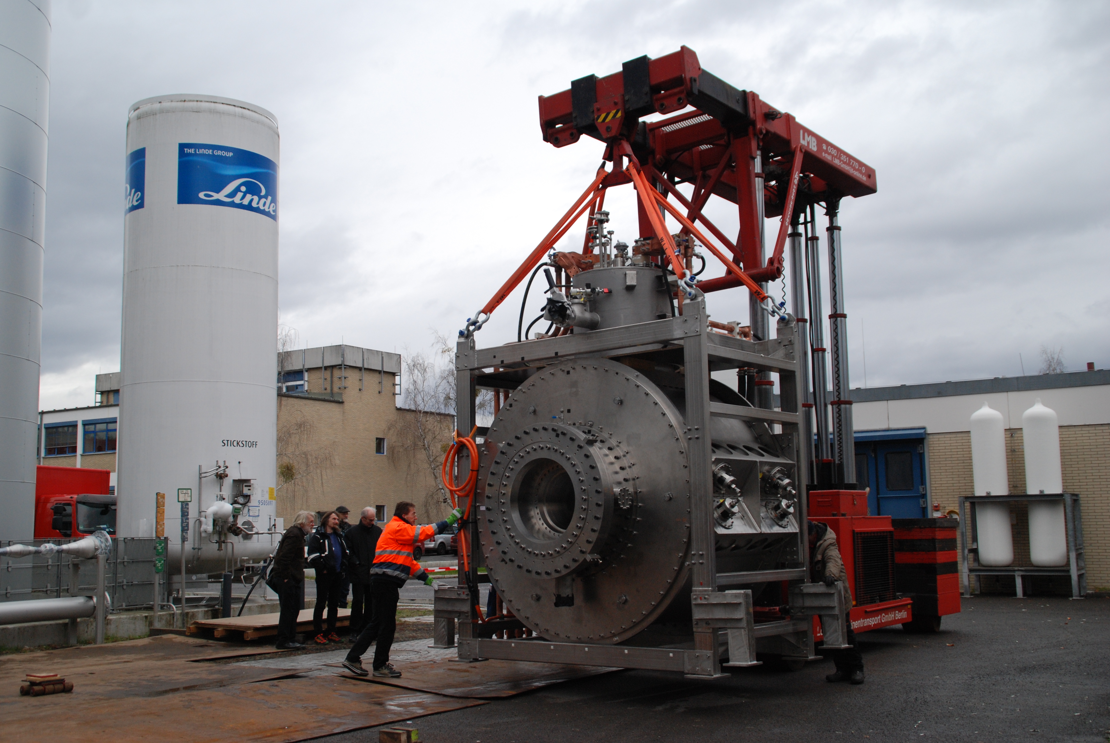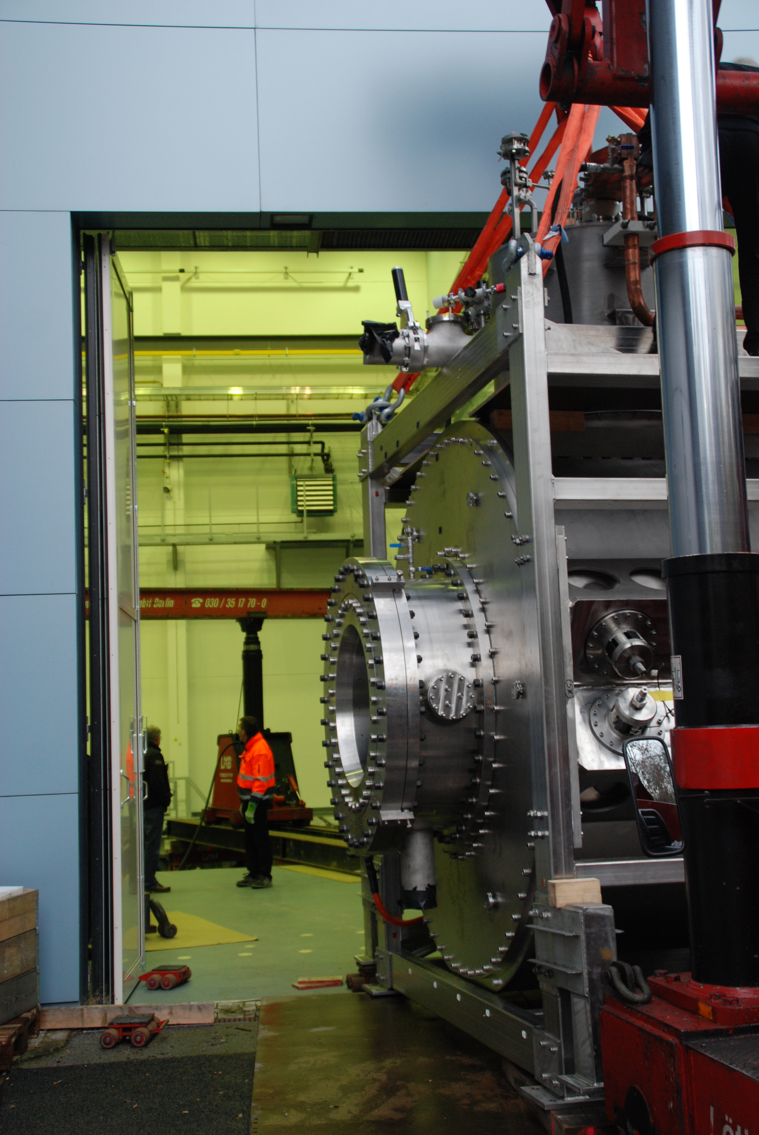 Auf Schwerlastrollen ging es dann „zweimal um die Ecke“ zur Neutronenleiterhalle II. Dort wurde der Magnet zentimeterweise über die Schwelle gezogen, wobei nur eine Fingerbreite Platz nach oben blieb. Ein Hubportal auf Schienen ließ dann den angehängten Magneten an seinen finalen Ort gleiten. Diese besondere Konstruktion war notwendig, da der Hallenkran nicht die erforderliche Belastbarkeit hat. Am darauffolgenden Montag, den 15.12. 14 wurde der Magnet dann auf 1 mm genau in seiner Endposition in Richtung des Neutronenleiters ausgerichtet.