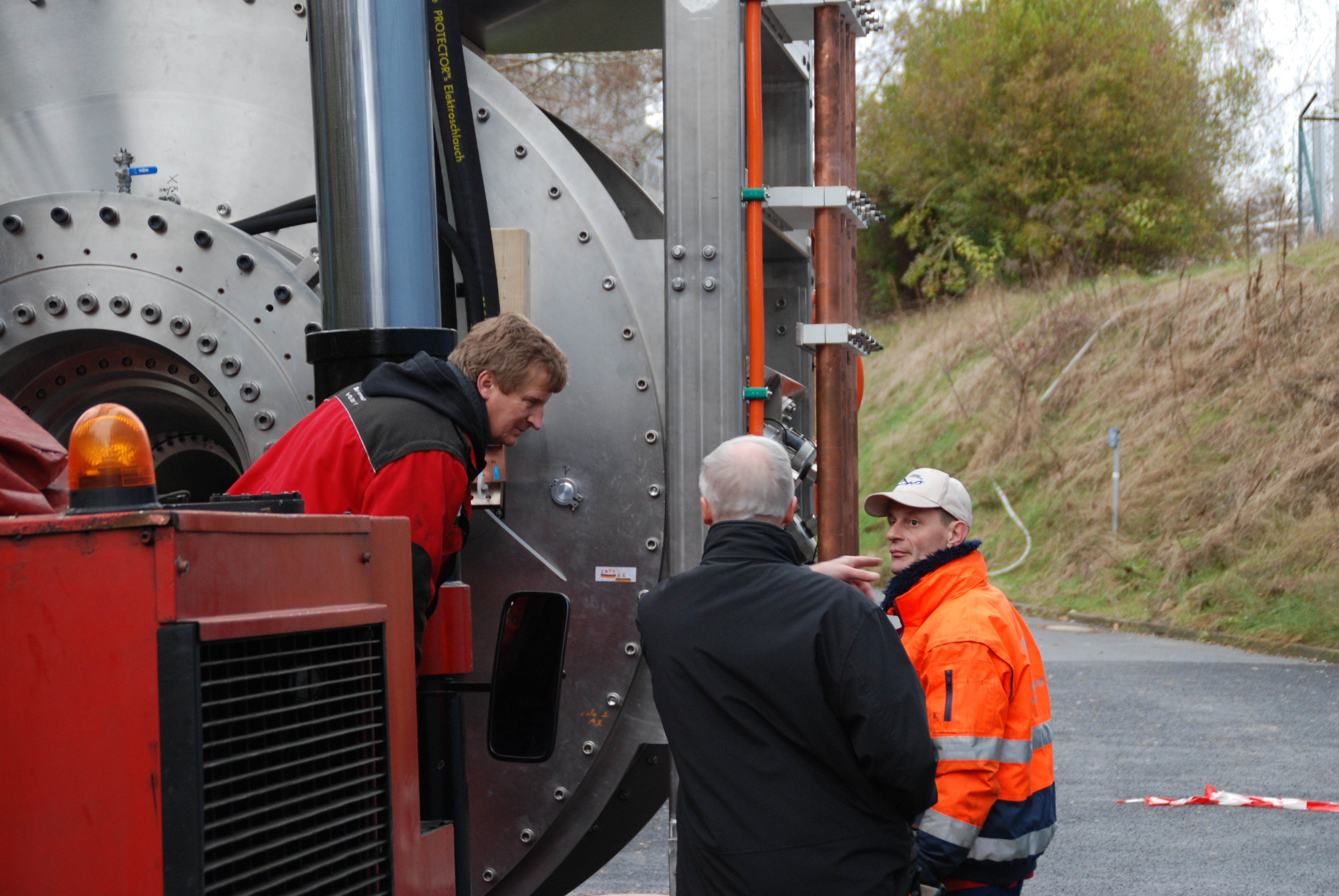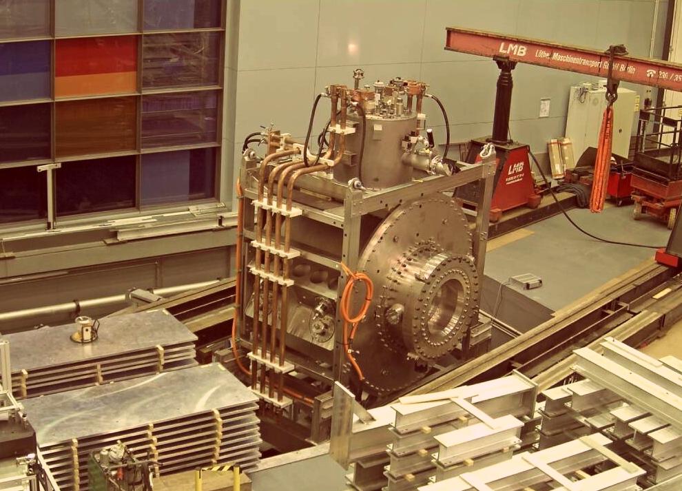 In den nächsten Wochen wird der Magnet wieder an seine Versorgungsleitungen für Wasser, Helium und elektrischen Strom angeschlossen werden. Eine besondere konstruktive Herausforderung ist dabei, dass der Magnet um insgesamt 30° drehbar gelagert ist und alle Versorgungsleitungen diesen Schwenk mitmachen müssen. Dazu waren für alle Medien geeignete bewegliche Lagerungssysteme entwickelt worden.