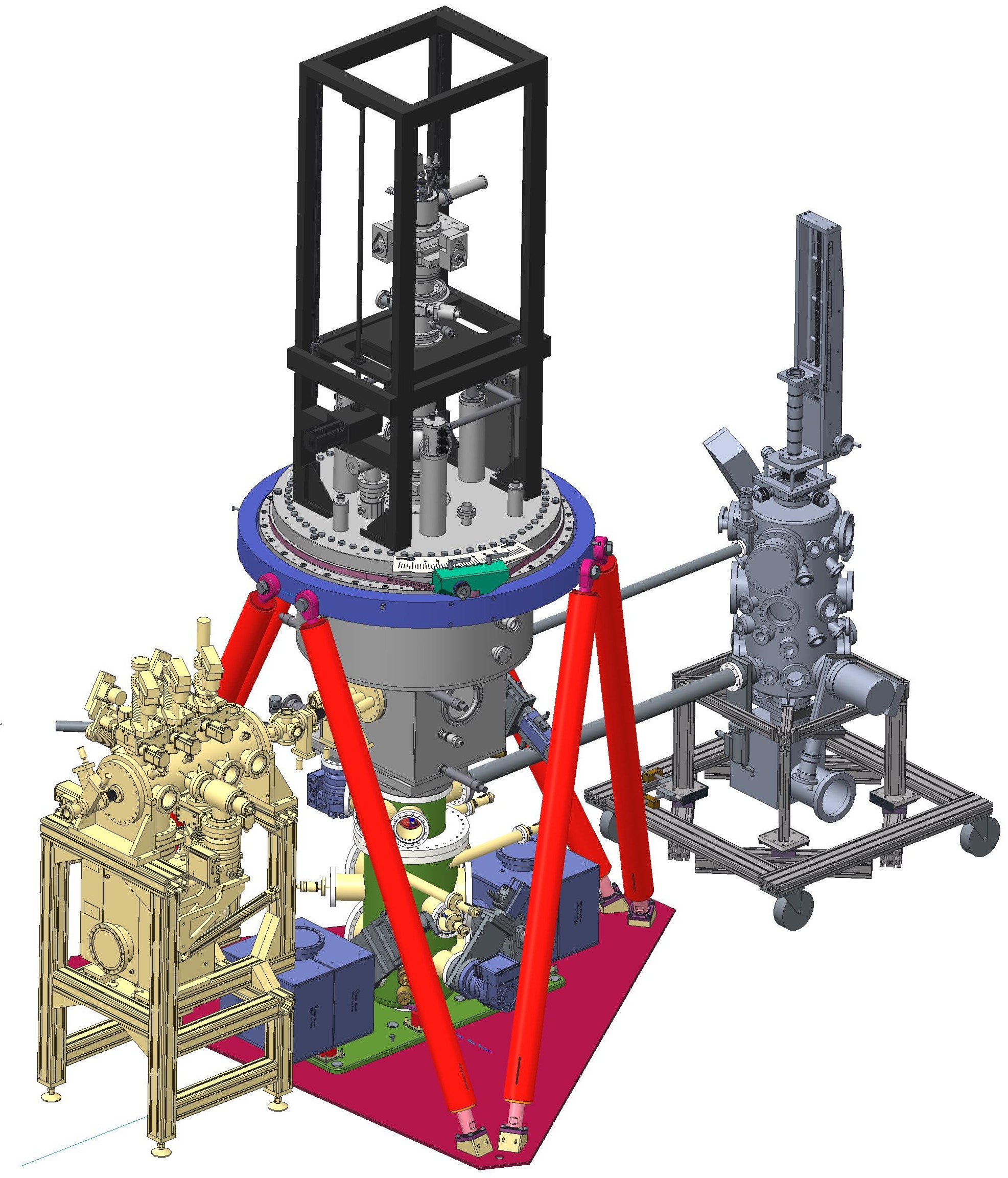 Schematische Darstellung der VEKMAG-Messstation: Der Vektormagnet befindet sich in der Vakuumkammer (grau), die in einem sechsbeinigen Gerüst aufgehängt ist. Unterhalb des Magneten liegt die Detektorkammer (grün), im Bildvordergrund ist die Depositionskammer (dunkelgrau) zu sehen. Die Strahlqualität wird durch eine Diagnose-Einheit (goldfarbig) kontinuierlich kontrolliert.
