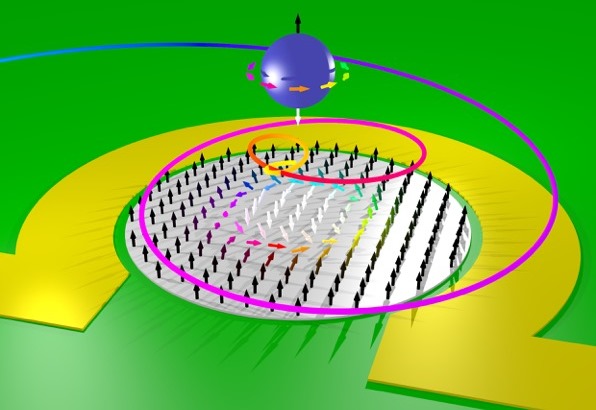 In der Mitte einer dünnen magnetischen Schicht befindet sich ein Wirbel. Ein kurzer Strompuls durch einen Nanodraht lenkt den magnetischen Wirbel (Skyrmion), aus seiner Ruhelage aus. Auf einer Spiralbahn bewegt es sich zurück in seine Ausgangsposition. Dies lässt sich mit Hilfe der Röntgenholografie beobachten. Die spiralförmige Bahn und das Skyrmion sind schematisch oberhalb der Struktur dargestellt. © Johannes Gutenberg-Universität Mainz