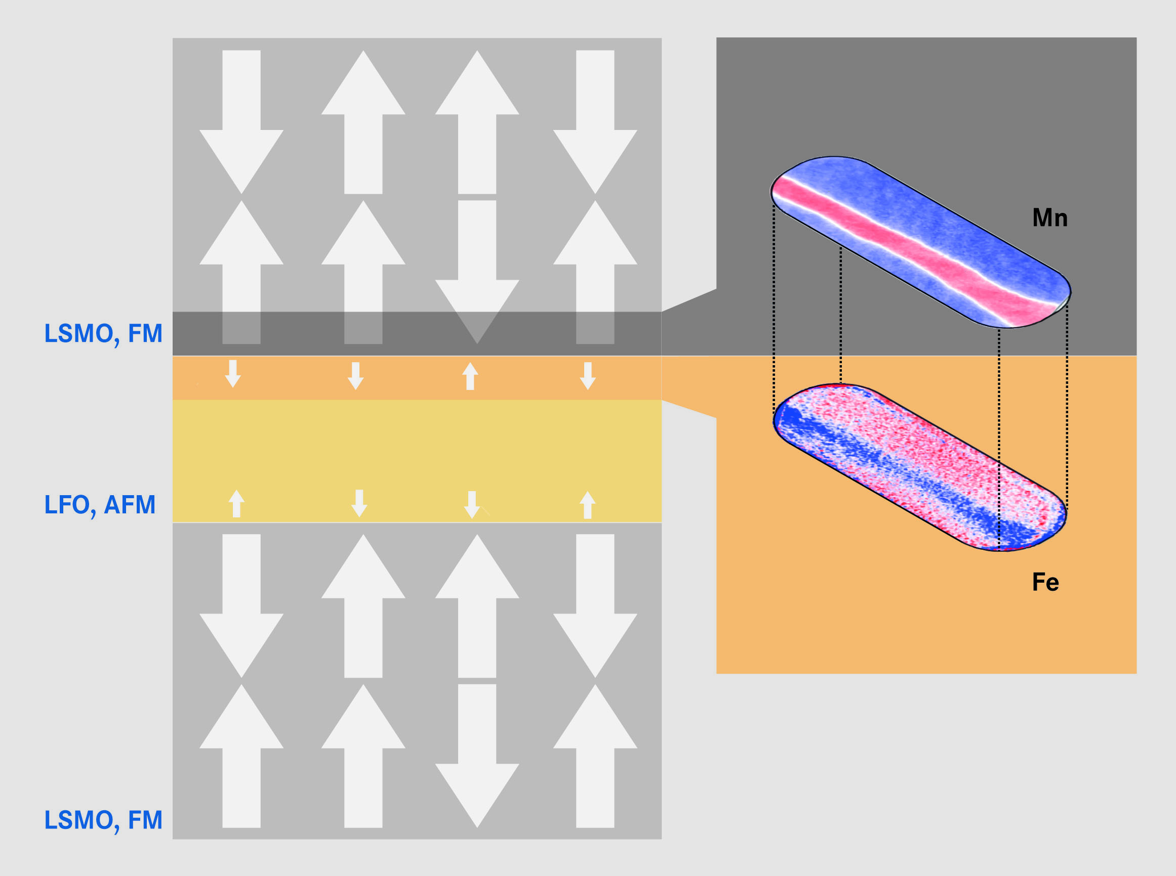 Die LFO-Schicht weist normalerweise eine antiferromagnetische Ordnung auf (AFM) und besitzt keine ferromagnetischen Domänen. Doch die ferromagnetischen Domänen (weiße Pfeile) der LSMO-Schichten bewirken, dass an den Grenzflächen in der LFO-Schicht ferromagnetische Domänen ausbilden, die antiparallel zu den angrenzenden Domänen der LSMO-Schicht ausgerichtet sind.