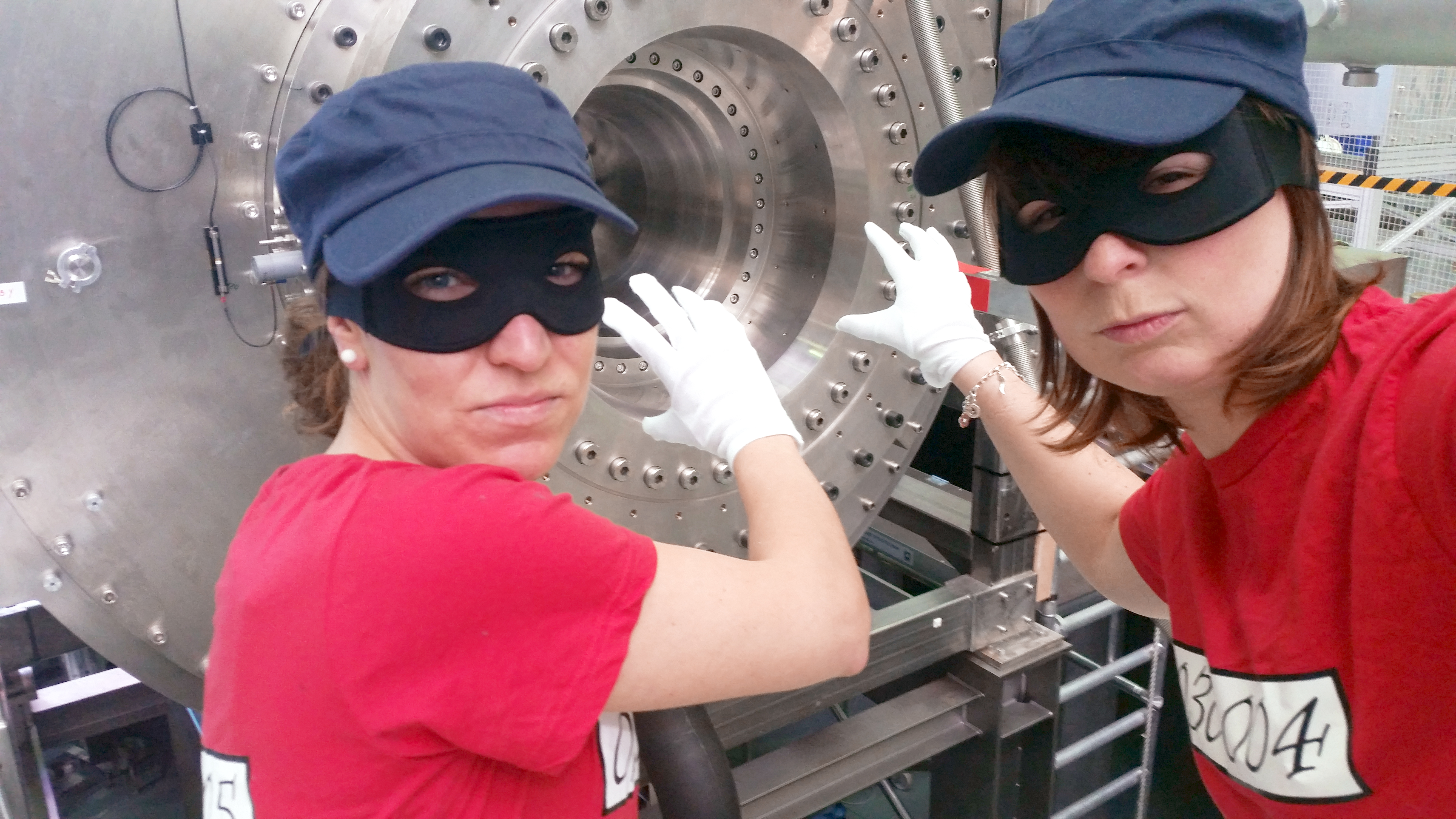 Mit finsterer Miene machen sich die HZB-Kolleginnen Jennifer Bierbaum und Stefanie Kodalle ans Werk: Die beiden Panzenknackerinnen wollen die 26 Tesla beim Hochfeldmagneten des HZB knacken. Glücklicherweise schießen sie im richtigen Augenblick ein Selfie mit dem Smartphone von dem wohl größten Moment in ihrer Verbrecherlaufbahn.