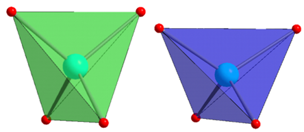 Tetrahedra with a nickel atom at their centre are somewhat elongated due to the Jahn-Teller effect (green), while the tetrahedrons with a copper atom at their centre are compressed (blue). © M. Tovar/HZB