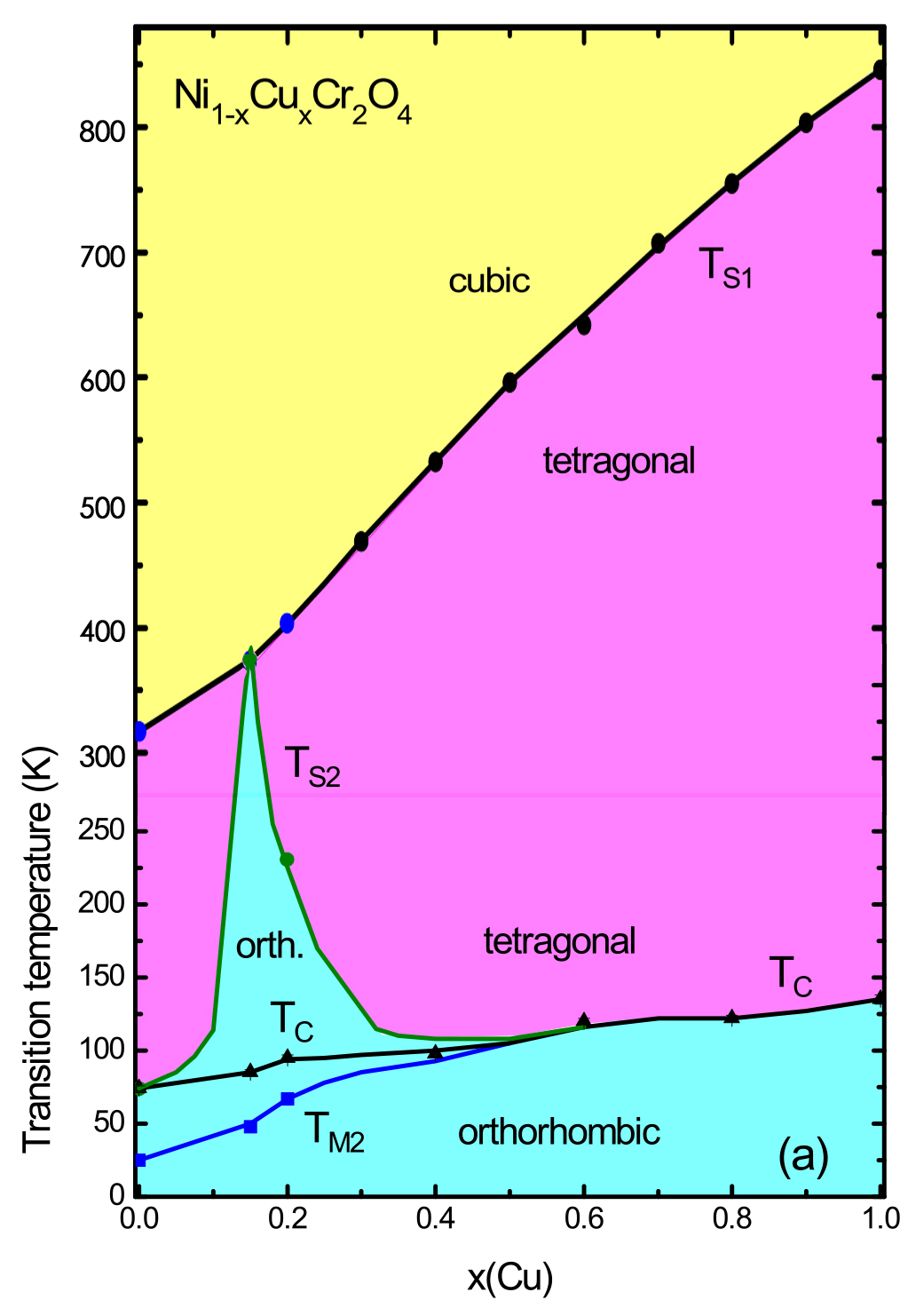 Only in the orthorhombic phase (light blue) magnetic ordering occurs, which for most of the crystal mixture ratios lies far below room temperature (293 K). The HZB researchers were able to identify two new states of magnetic ordering (Tc and TM2). At a 15 % proportion of copper, the orthorhombic phase remains stable at temperatures considerably above room temperature (Ts2). © Reehuis/HZB