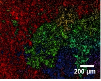 Ausschnitt aus der am Computer errechneten Qualitätslandkarte der Elektrode. Rot sind die gut vernetzten Bereiche dargestellt. doi:10.1016/j.nanoen.2015.06.027 © Elsevier aus