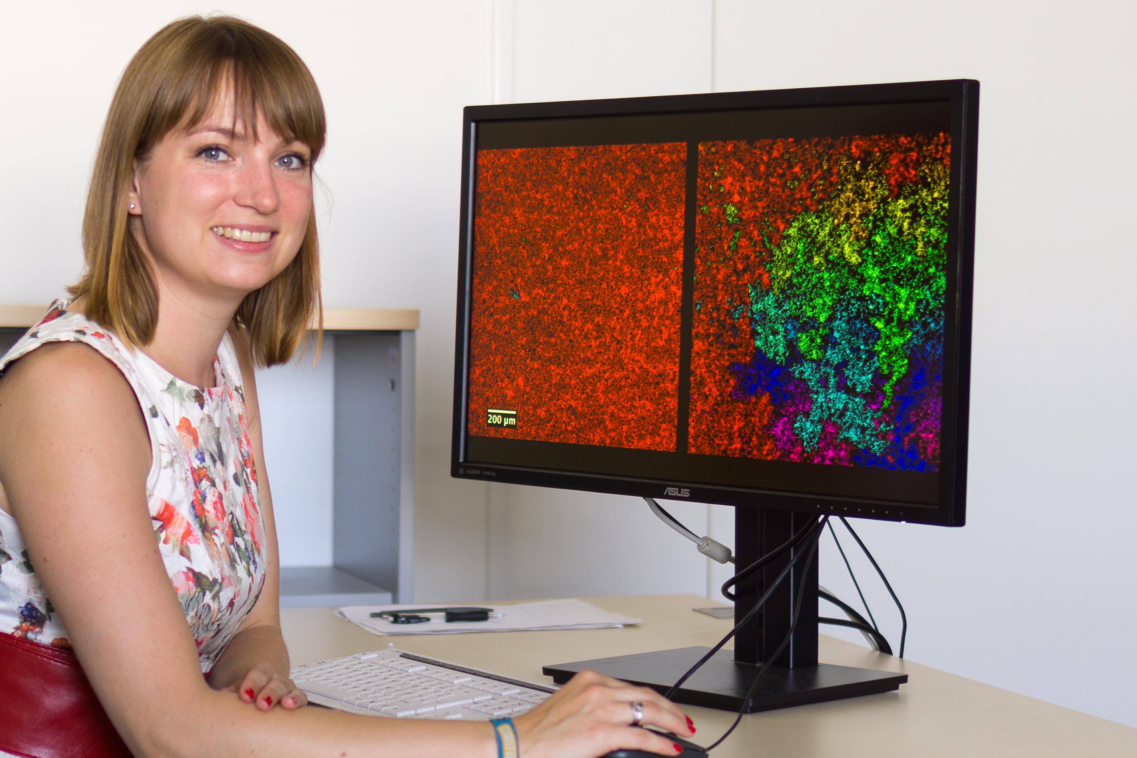 Manuela Göbelt is evaluating SEM-images to calculate the local degree of networking. Photo: Björn Hoffmann.