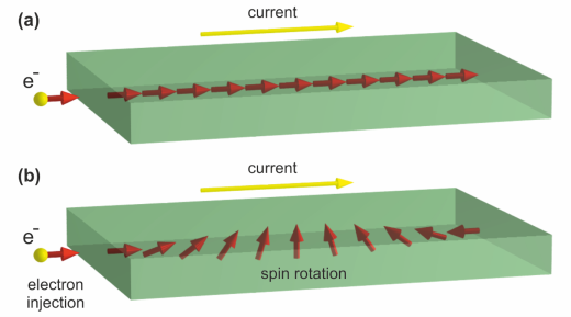 Ein elektrischer Strom kann die Spins im Graphen beeinflussen: a) Ohne Goldatome bleiben die Elektronenspins erhalten. b) Durch die Nähe zu Goldatomen drehen sich die Spins nach 40 Nanometern um 180 Grad. Dieser Effekt kann auf einem Halbleitersubstrat genutzt werden.