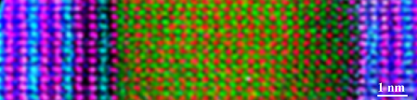 Mit Hilfe der EELS-Elektronenspektroskopie lassen sich im Rasterelektronenmikroskop die einzelnen Atome in der Heterostruktur kartieren: Die supraleitenden YBaCuO-Regionen sind an Yttrium (Blau) und Kupfer (pink) erkennbar, während in der ferromagnetischen Schicht Mangan (grün) und Lanthan (rot) eingebaut ist. © MPI Stuttgart