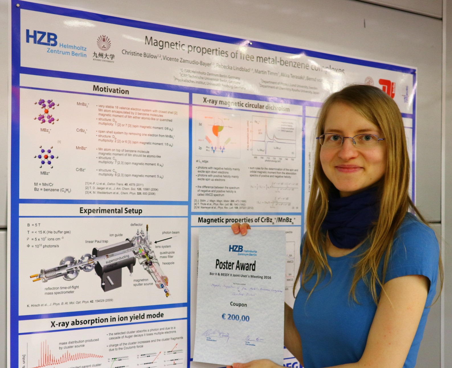 Die Forschung mit Synchrotron-Strahlung stand von Mittwoch bis Donnerstag im Vordergrund. Dabei vergab der Freundeskreis Helmholtz-Zentrum Berlin den Innovation Award und den Ernst-Eckard-Koch Preis. Den Posterpreis des HZB-Usermeetings erhielt Christine Bülow für ihr Poster zu "Magnetic properties of free metal-benzene complexes".