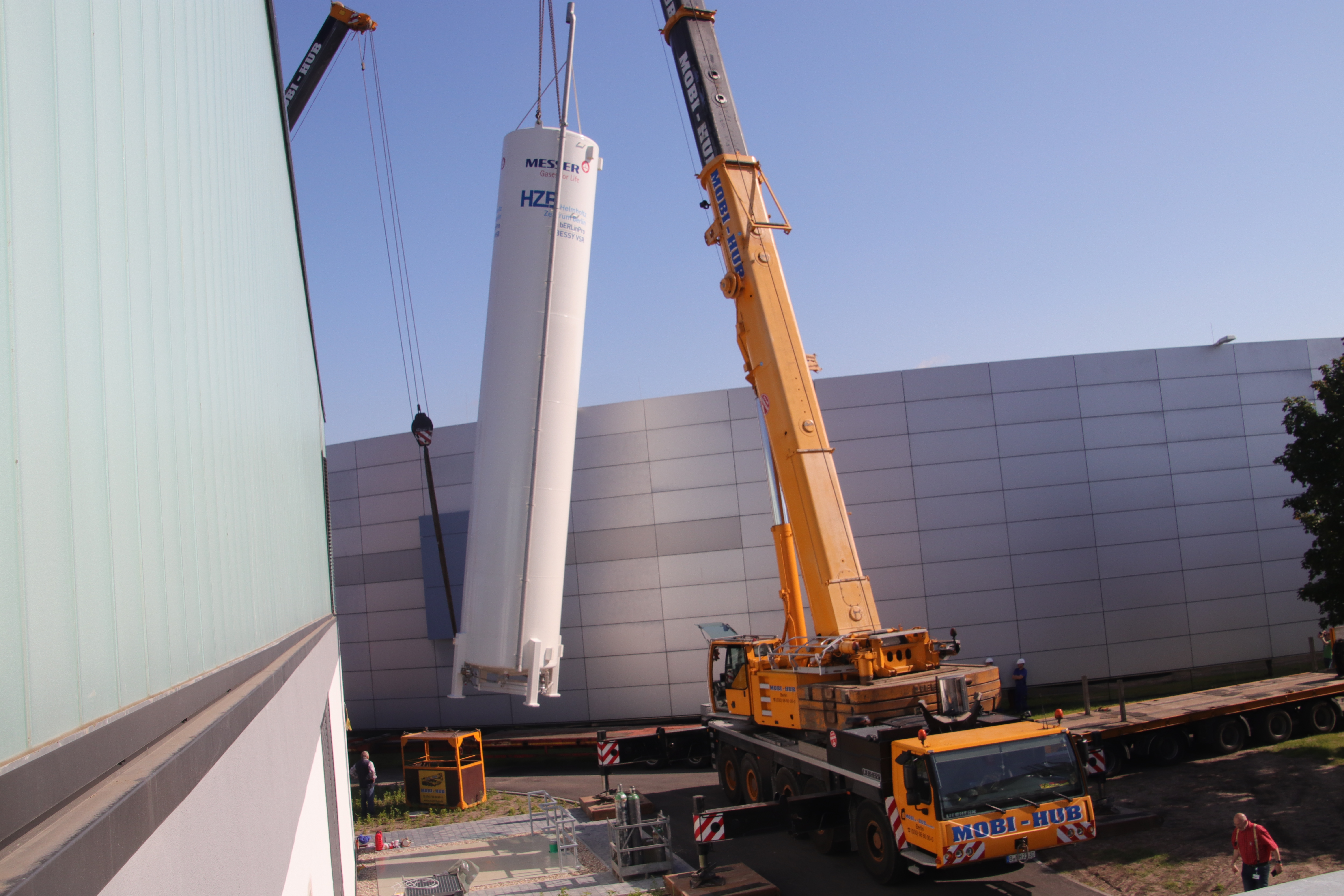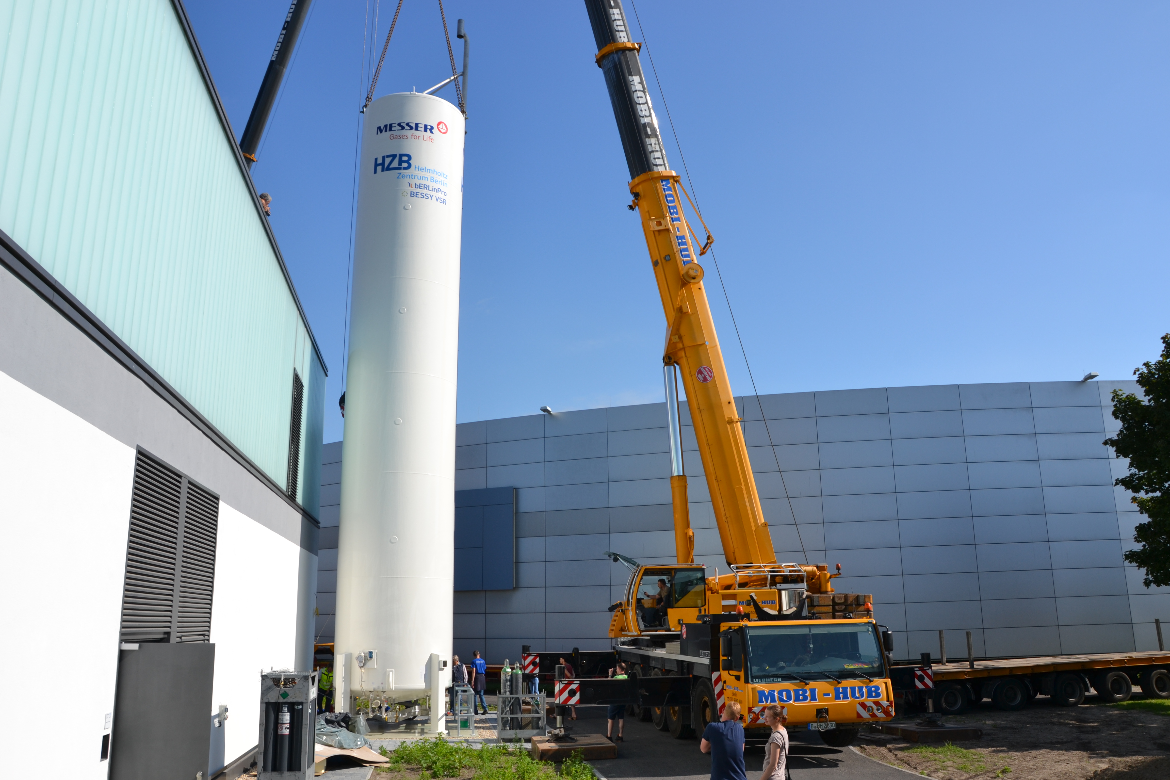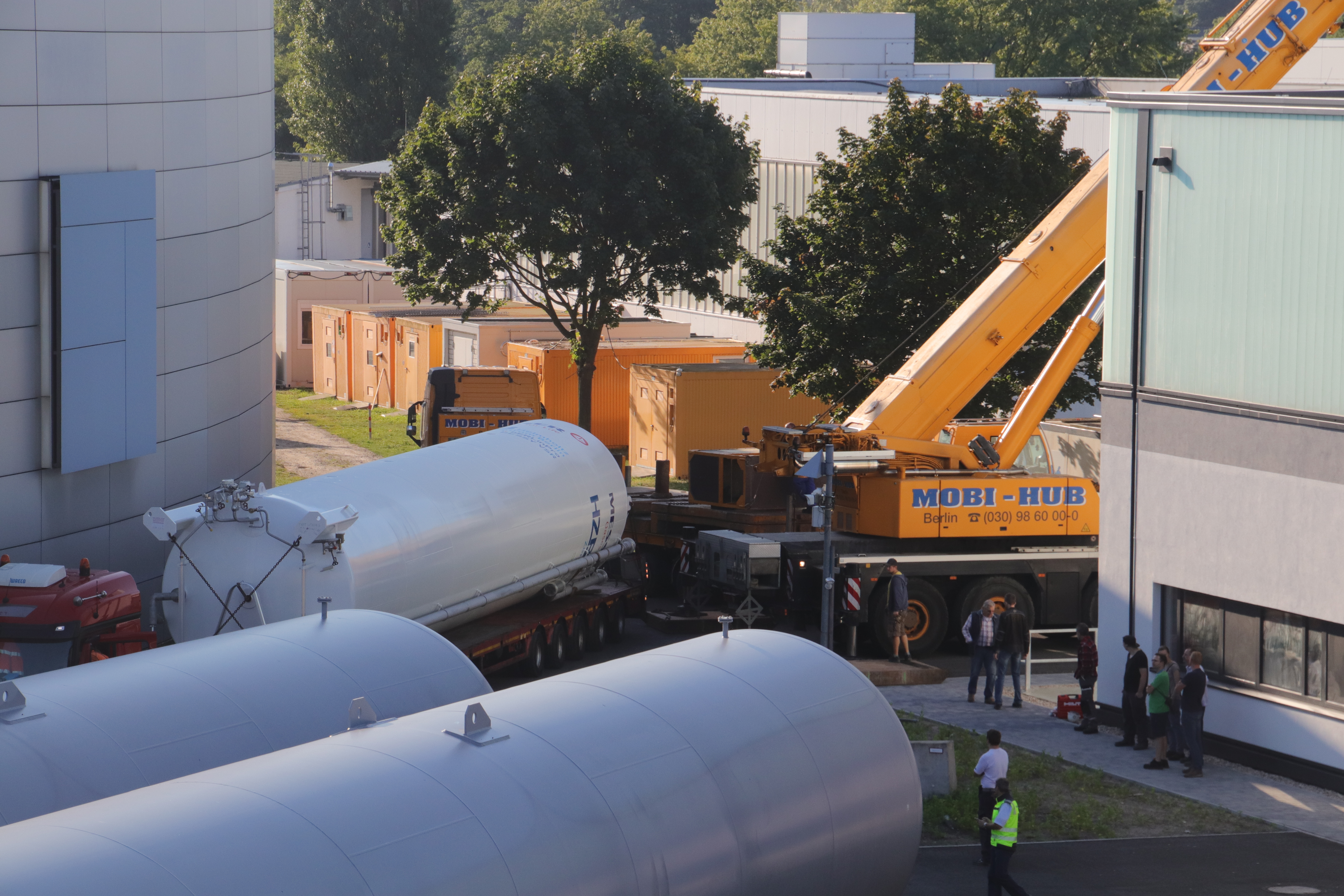 The nitrogen tank was brought to Berlin by on a 25 metre long heavy-duty transporter from Děčín (Czech Republic) and then erected with two cranes. Our colleague Roswitha Schabardin describes the spectacular event in our blog.