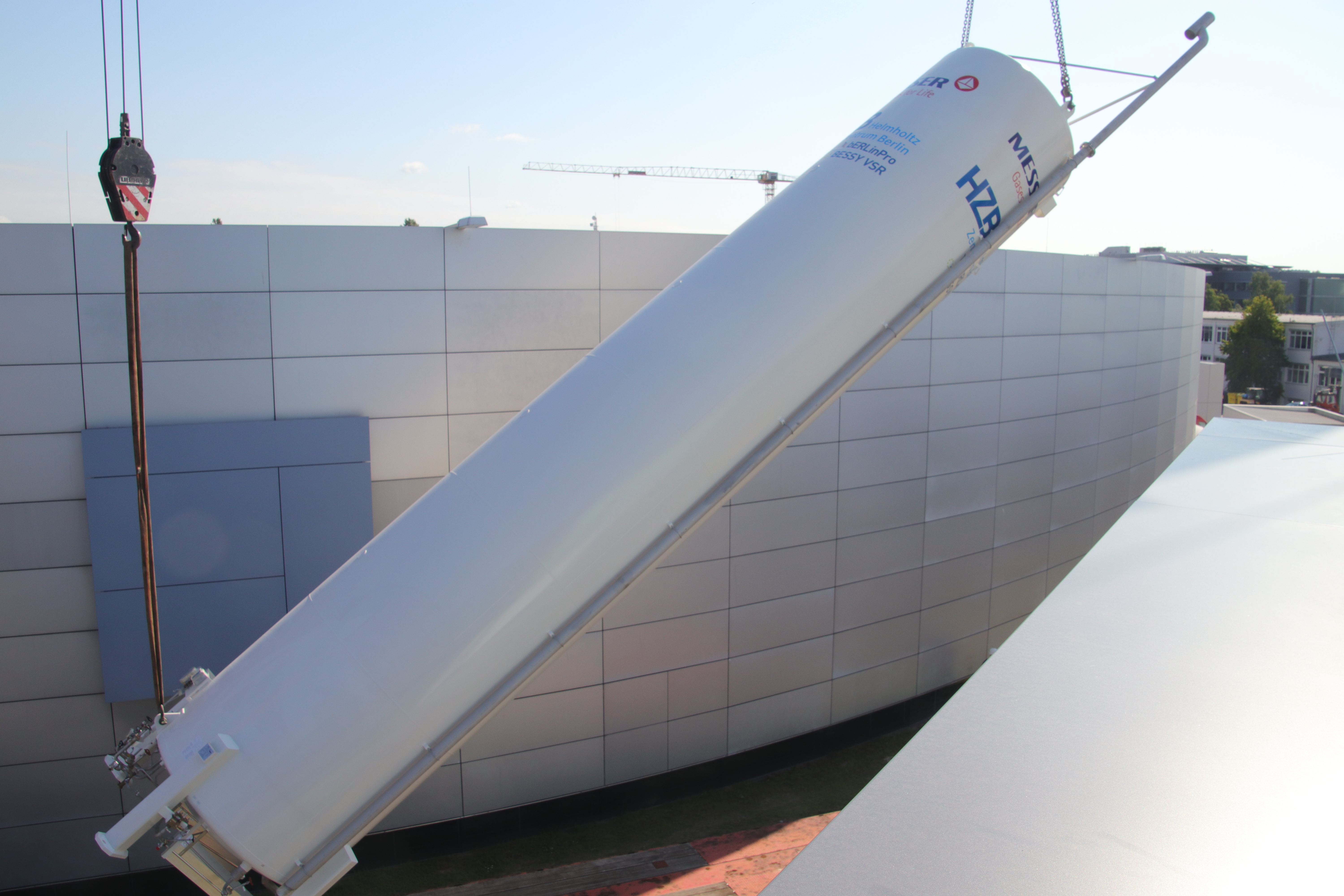 Rising 18 metres into the air, the nitrogen tank on the Helmholtz-Zentrum Berlin campus in Adlershof was installed on 18 July 2017. It can store up to 80 cubic metres of liquid nitrogen. This nitrogen will be used for pre-cooling the cooling system which is necessary for operating the new energy recovery linear accelerator (bERLinPro). The HZB experts are currently setting up a prototype for testing the potential of this accelerator technology.