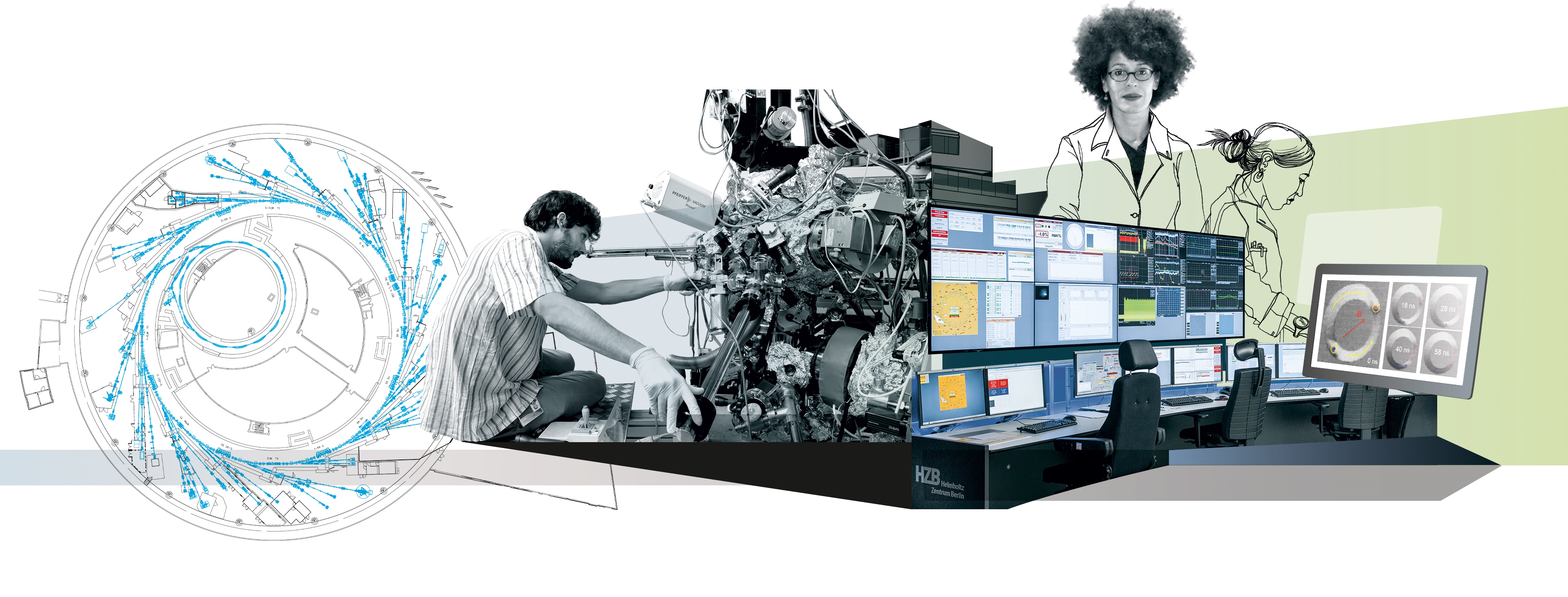 Eine Info-Broschüre, illustriert mit einer Kombination aus Zeichnungen und Fotografien, ist die neue Visitenkarte des HZB. Knapp und verständlich beschreibt sie die wichtigsten Forschungsschwerpunkte des Zentrums, stellt Großgeräte und Labore vor und zeigt, warum das HZB ein weltweit attraktiver Arbeitsort ist.