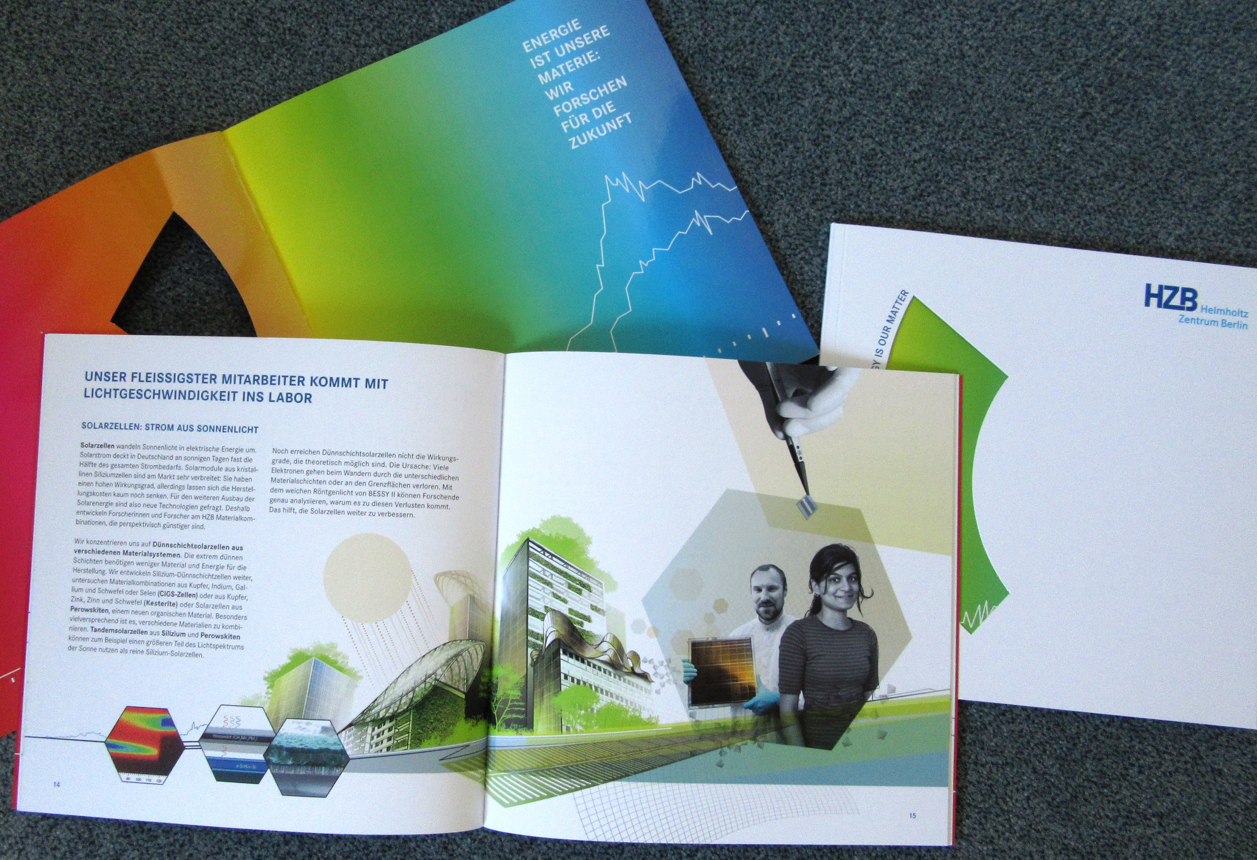 „Mit Absicht haben wir uns auf das beschränkt, was den Kern des HZB ausmacht“, erläutert Ina Helms, die Leiterin der Kommunikationsabteilung. Eine umfassendere Informationsquelle ist im digitalen Zeitalter das Internet und hier die HZB-Webseite. „Die Broschüre gibt einen ersten Einblick, bringt die Forschungsstrategie und die Mission des HZB auf den Punkt und ist deshalb im wahrsten Sinne des Wortes eine Visitenkarte. Aus diesem Grund war uns auch die Optik sehr wichtig“, ergänzt Ina Helms. „Das Auge isst bekanntlich mit, und auch die Texte sollen leicht verdaulich sein.“