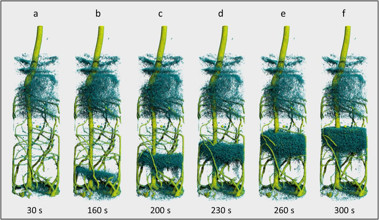 Zeitaufgelöste Tomographie einer Lupinenwurzel (gelbgrün), nachdem deuteriertes Wasser (D2O) von unten zugegeben wurde. Der Zeitverlauf zeigt die aufsteigende Wasserfront (H2O, dunkelblau), die durch das D2O von unten verdrängt wird. Die komplette Abfolge ergibt ein Video. Urheber: Christian Tötzke © Universität Potsdam