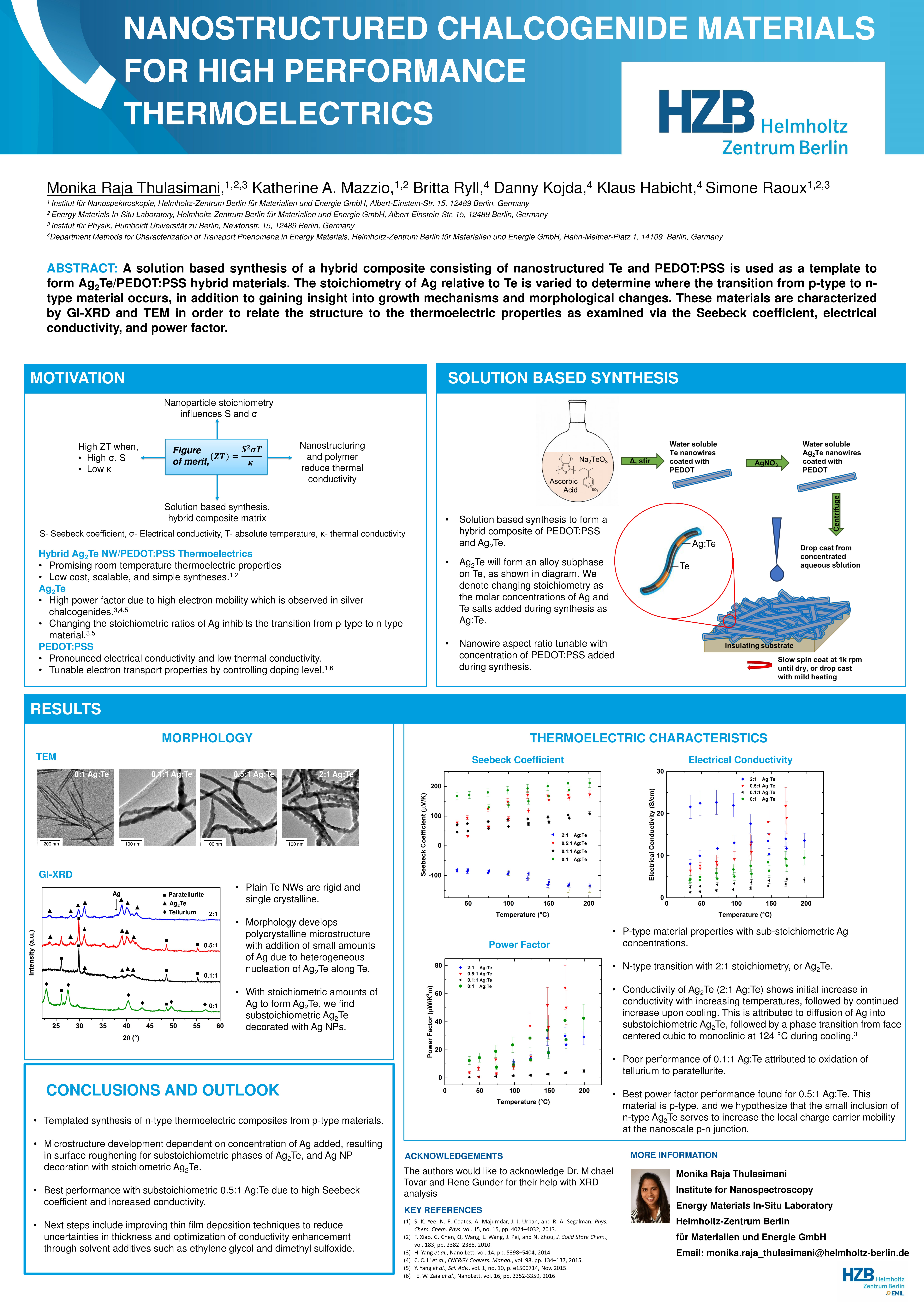 Monika Raja Thulasimani promoviert über thermoelektrische Materialien in der Graduiertenschule MatSec am Helmholtz-Zentrum Berlin (HZB). Auf der European Conference on Thermoelectrics 2017 hat die Doktorandin einen Posterpreis gewonnen. Sie erklärte ein Verfahren, mit dem sich effizientere hybride thermoelektrische Materialien aus einer Polymerverbindung und Silbertellurit herstellen lassen.