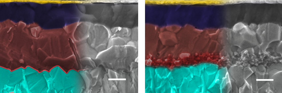 Rasterelektronenmikroskopien der Perowskit-Solarzellen, links mit glatter, rechts mit mesoporöser Grenzschicht. Zur Verdeutlichung wurden die Bilder halbseitig eingefärbt: Metalloxid (türkis), Grenzschicht (rot), Perowskit (braun), lochleitende Schicht (dunkelblau) sowie Goldkontakt. Die Skala zeigt 200 nm.