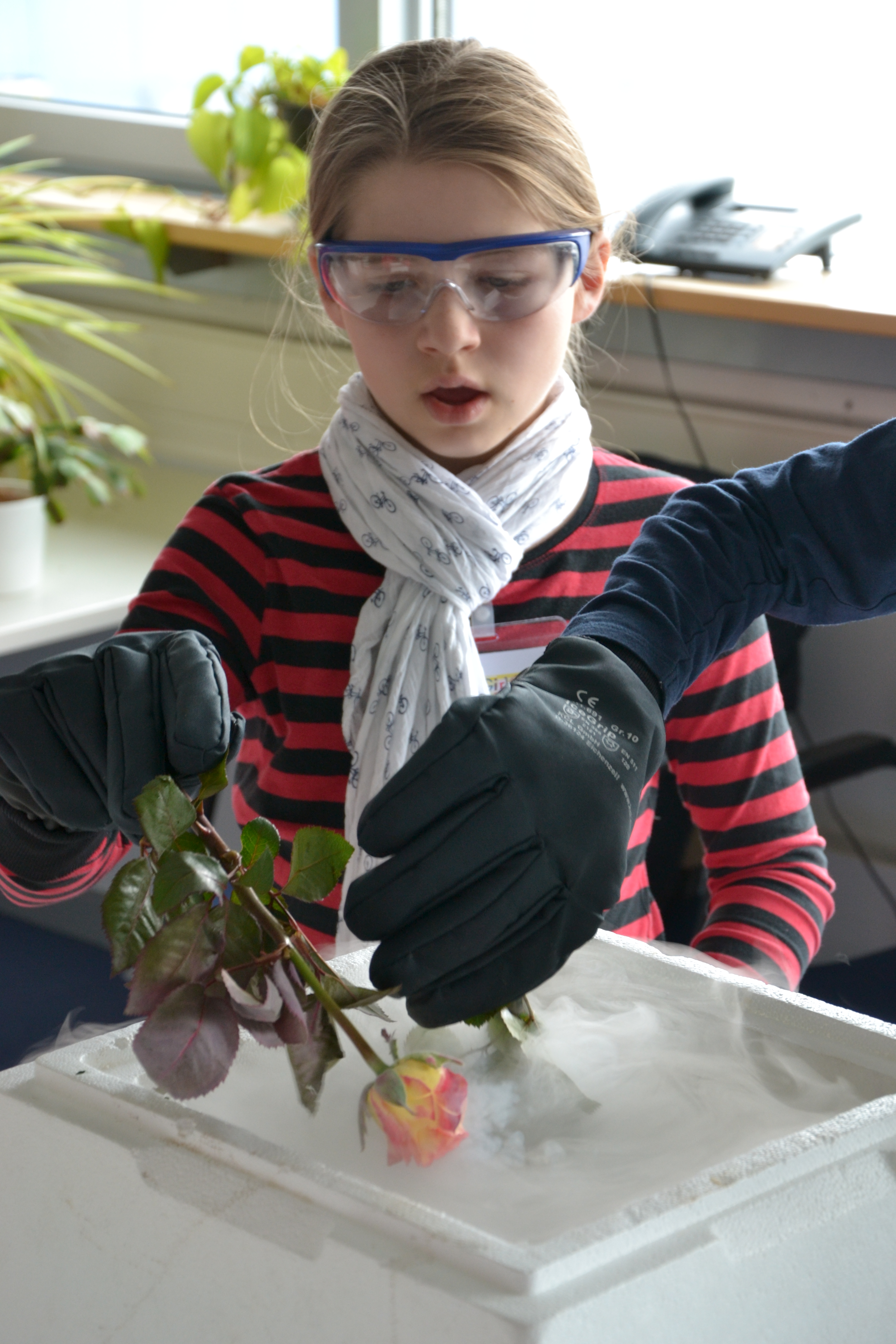 Eine Rose im Stickstoff, die anschließend in tausend Stücke zerfällt. Neben dem selbstgemachten Eis ein sehr beliebtes Experiment mit dem kalten Element.