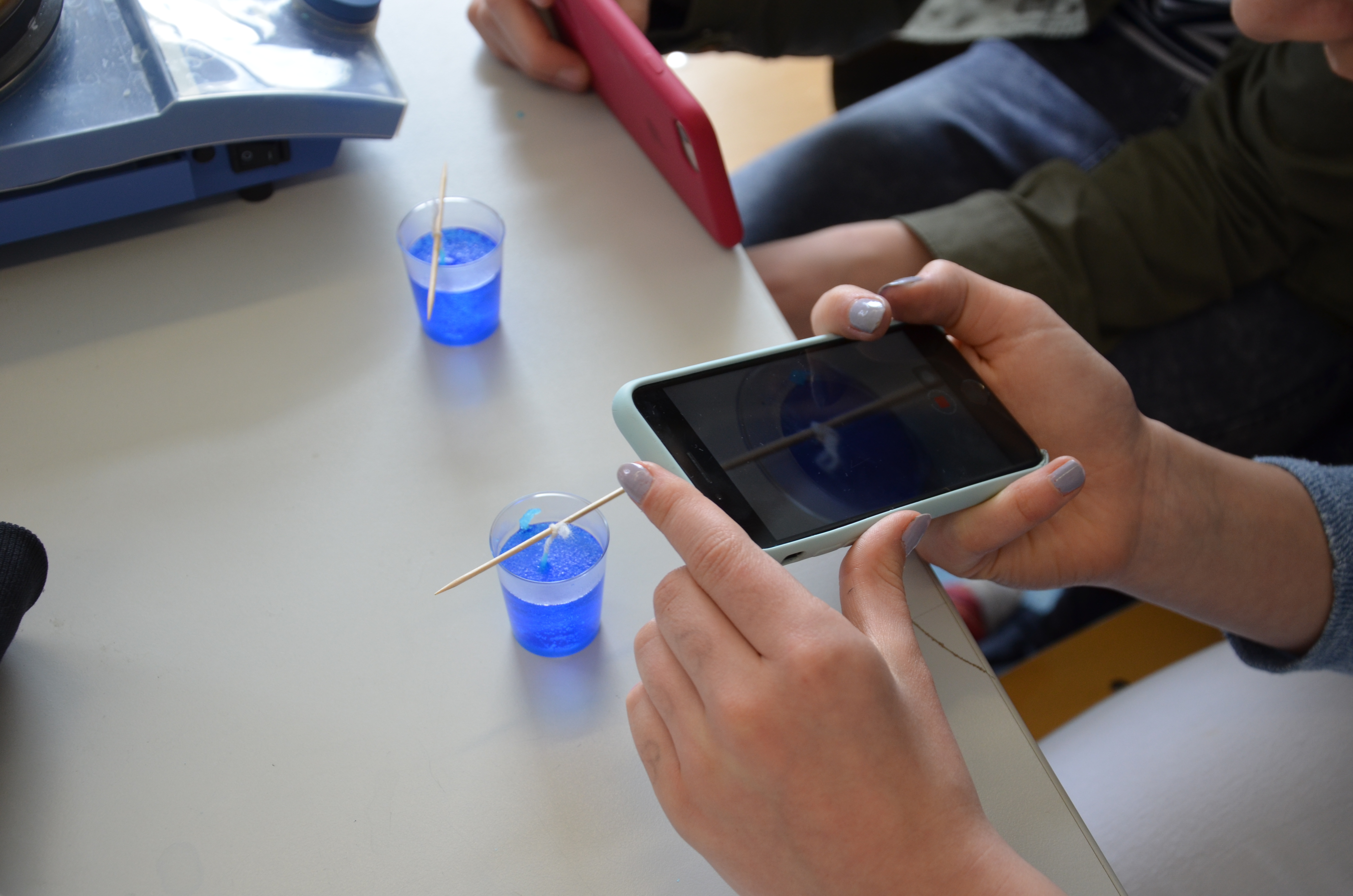 Die Mädchen haben mit ihrem Smartphone das Wachsen der Kristalle im Zeitraffer aufgenommen. Die Kristalle konnten sie mit nach Hause nehmen und zeigen, was sie im Workshop "Kristalle selber züchten" hergestellt haben.