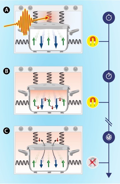 Um diesen Prozess zu veranschaulichen führen die beiden Physiker einen Topf mit Wasser an, der bei geschlossenem Deckel in einen heißen Ofen gestellt wird. Die heiße Luft im Ofen entspricht dem heißen Atomgitter, während das Wasser im Topf die Spins verkörpert (siehe Abbildung). Wird das Atomgitter erhitzt, dann übertragen die Zufallsschwingungen der Atome die magnetische Ordnung von Spintyp 1 auf Spintyp 2. Daher schrumpfen die beiden magnetischen Momente M1 (blaue Pfeile in Feld B) und M2 (grüne Pfeile) um genau den gleichen Betrag (rote Pfeile), so dass sich die Gesamtmagnetisierung M1-M2 nicht verändert. Dieser Prozess entwickelt sich auf der schnellen Zeitskala und wird durch die Austausch-Wechselwirkung vermittelt, die stärkste Kraft im Magnetismus. Die Atomspins werden gezwungen, sich mit konstanter Gesamtmagnetisierung aufzuheizen, genau wie Wasser in einem geschlossenen Topf, der ein festes Volumen besitzt.