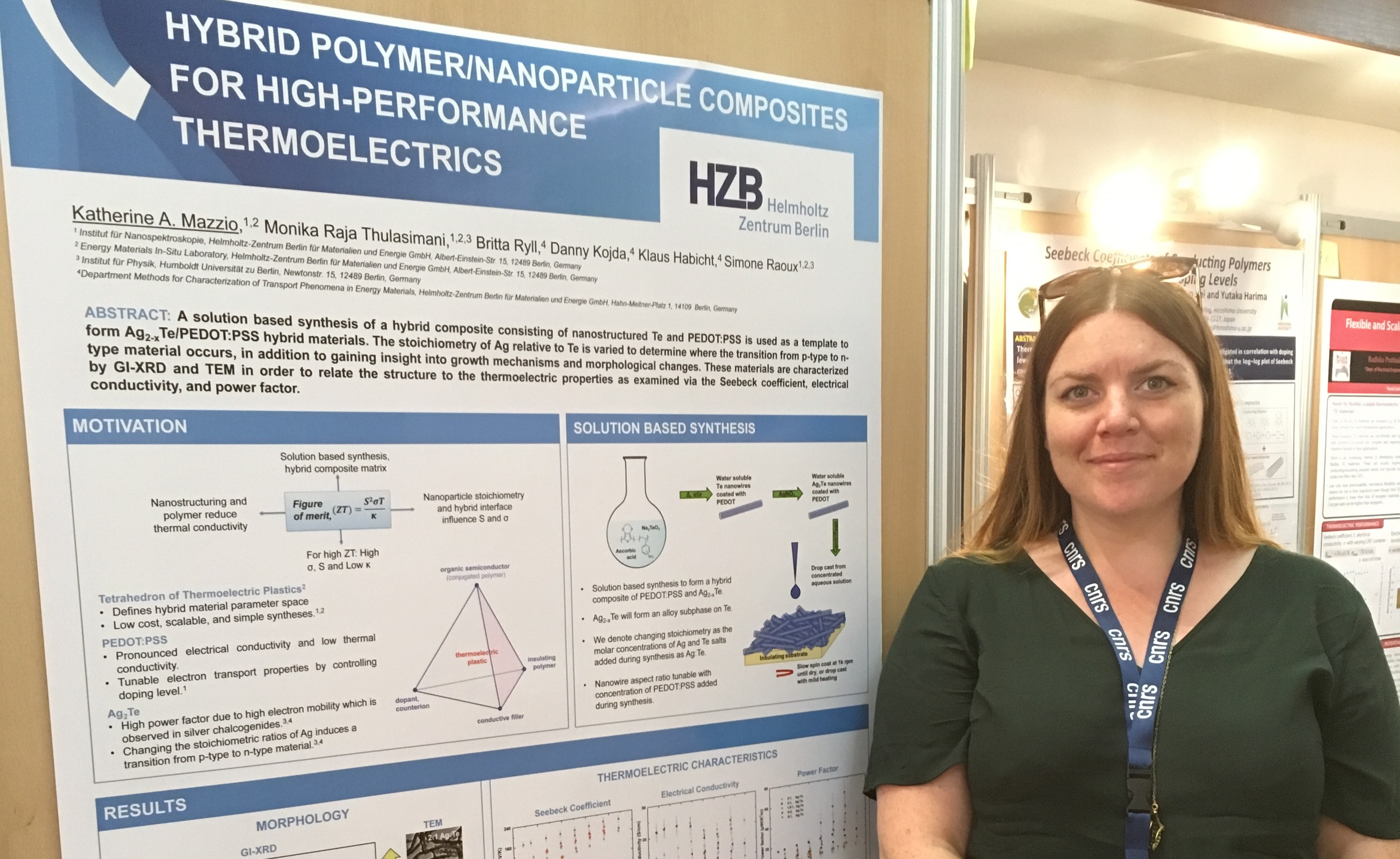 Das Poster mit dem Titel "Hybrid Polymer/Nanoparticle Composites for High-Performance Thermoelectrics" präsentiert ein neues Verfahren, das das HZB-Team für die Synthese von hybriden thermoelektrischen Materialien entwickelt hat. „Wir untersuchen hybride thermoelektrische Materialien aus anorganischen Nanostrukturen in leitenden Polymermatrizen für Raumtemperaturanwendungen“, erklärt Katherine Ann Mazzio. „In diesem Beitrag manipulierten wir die Stöchiometrie von Ag2-xTe Nanokristallen, die mit dem leitenden Polymer PEDOT:PSS beschichtet wurden, und verfolgten, wie Veränderungen in der Stöchiometrie die Struktur/Eigenschaftsbeziehungen beeinflussten“.