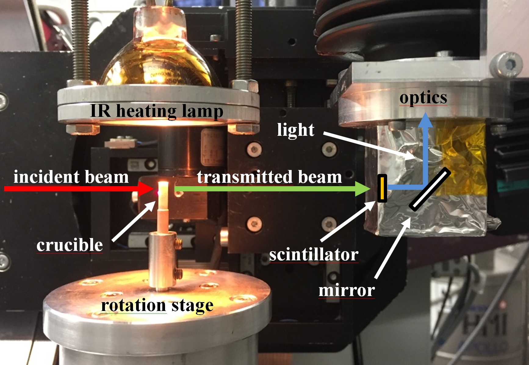 Experimental setup is composed of a fast-rotation stage, an IR heating lamp (temperature up to 800 °C), a BN crucible transparent to X-rays, a 200-μm thick LuAG:Ce scintillator, a white-beam optical system, and a PCO Dimax CMOS camera. The incident (red) and transmitted (green) X-ray beams as well as the light path from the scintillator to the camera (blue) are shown. © HZB