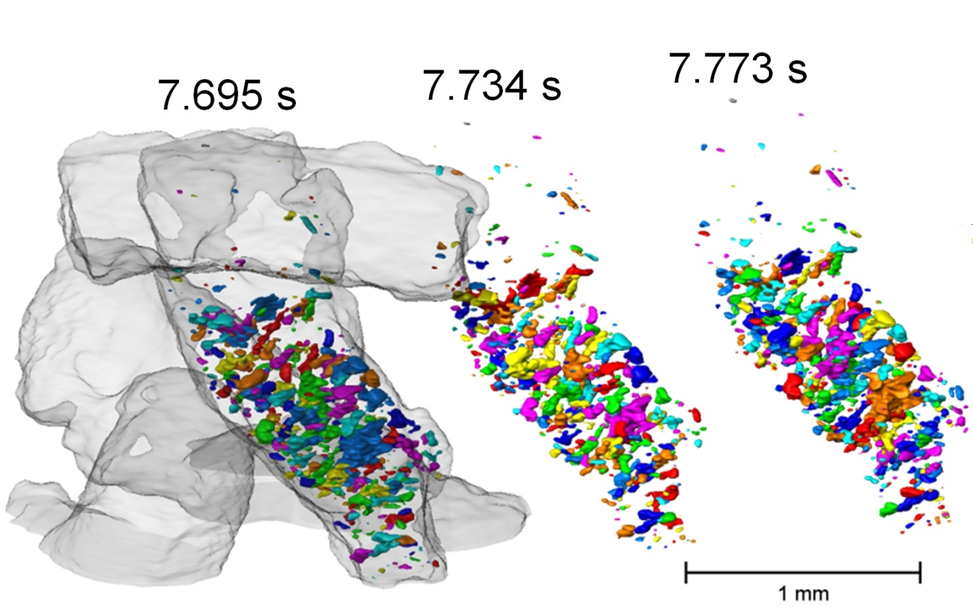 As a first example, the team investigated granules of aluminium alloys that become a metallic foam when heated. To do this, they mounted a powerful infrared lamp above the metal granulate to heat the sample to about 650 degrees Celsius. A complete 3D tomographic image with spatial resolution of 2,5 micrometers (pixel size) was generated every 40 milliseconds. The nearly 400 tomographic 3D images now allow detailed, time-resolved analysis of the process as it occurred,.