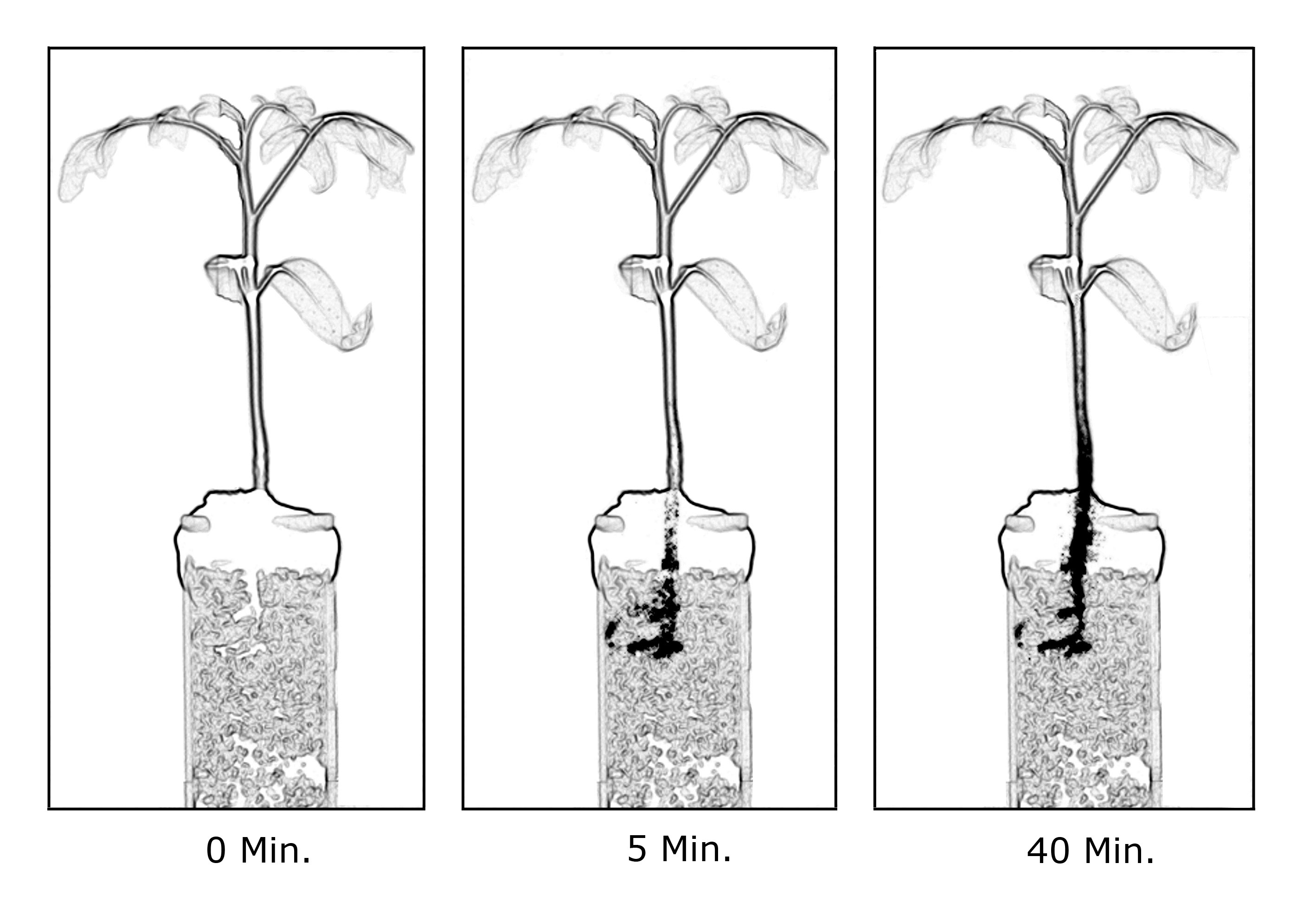 Die drei Neutronenradiogramme zeigen aufsteigendes Wasser in einer Tomatenpflanze. Die Radiogramme entstehen auf ähnliche Weise wie Röntgenaufnahmen, wobei Neutronen im Gegensatz zu Röntgenstrahlen auch Wasserstoff deutlich zeigen. Der Wasserbehälter, in dem sich die Wurzel der Pflanze befindet, ist aus technischen Gründen nach oben hin abgedichtet worden.
