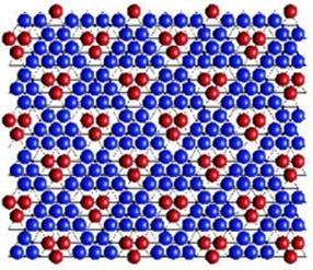 Anordnung der Natriumatome im Natriumkobaltoxid, wenn 80% der verfügbaren Natriumplätze besetzt sind. Die Farben Rot und Blau entsprechen den zwei möglichen Positionen der Natriumatome.