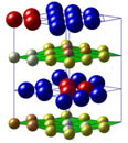 Schichtstruktur von Natriumkobaltoxid. Schichten aus Natriumatomen (blau oder rot) wechseln sich mit solchen aus Kobalt und Sauerstoff ab. Die Sauerstoffatome sind nicht gezeigt. Sie sind in den gleichen Schichten angeordnet wie die in Gold, Silber und Bronze dargestellten Kobaltatome. Die Kobaltoxid-Schicht ist nicht eben, sondern leicht verbogen. Die verschiedenen Farben deuten an, wie die Lage der einzelnen Atome von der Idealebene abweicht.