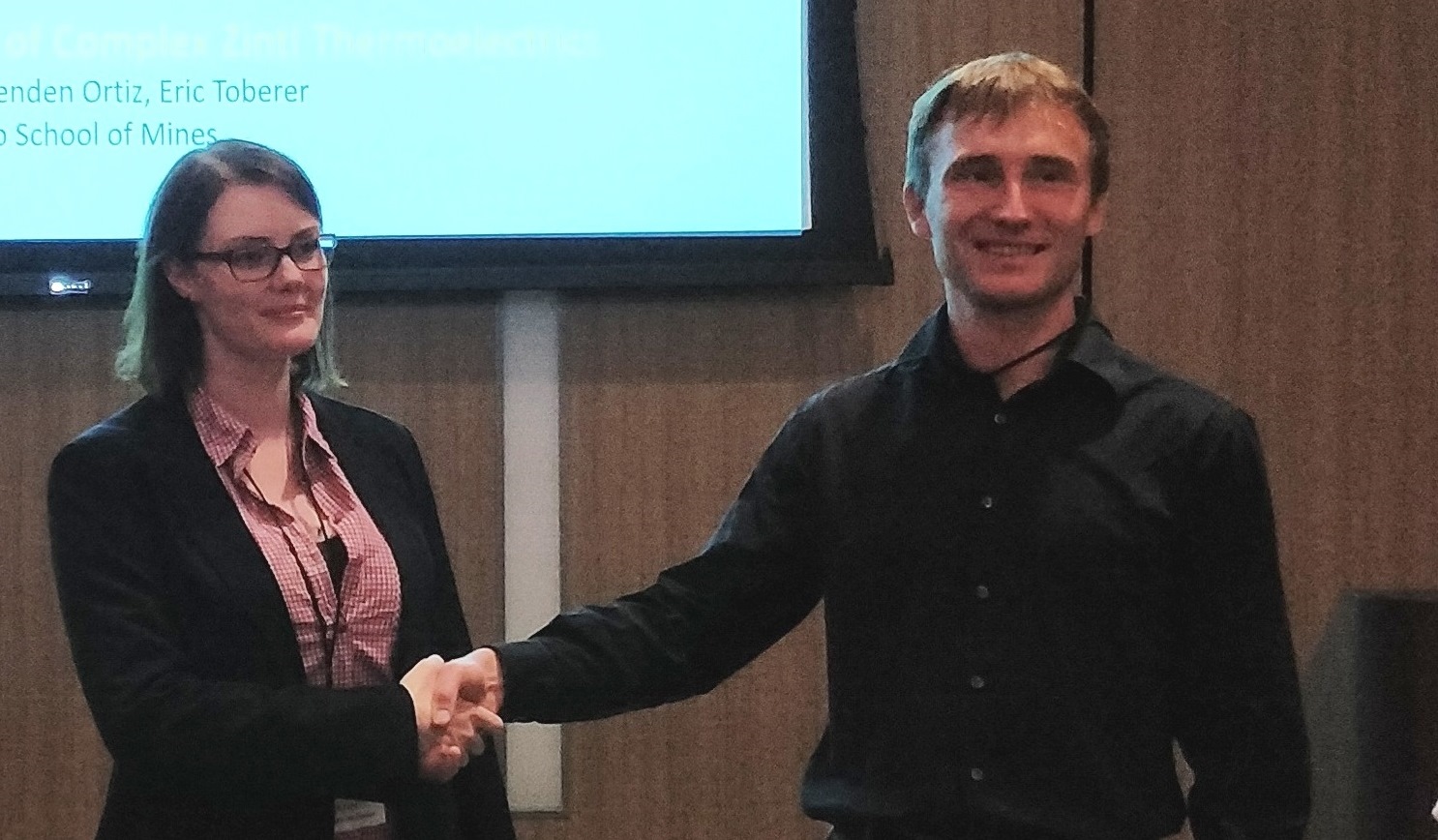 Andriy Zakutayev (NREL) hat Fredrike Lehmann im Namen der Jury für ihren Posterbeitrag auf der ICTMC-21 in Boulder, Colorado, USA, einen Preis überreicht. Bild. Privat